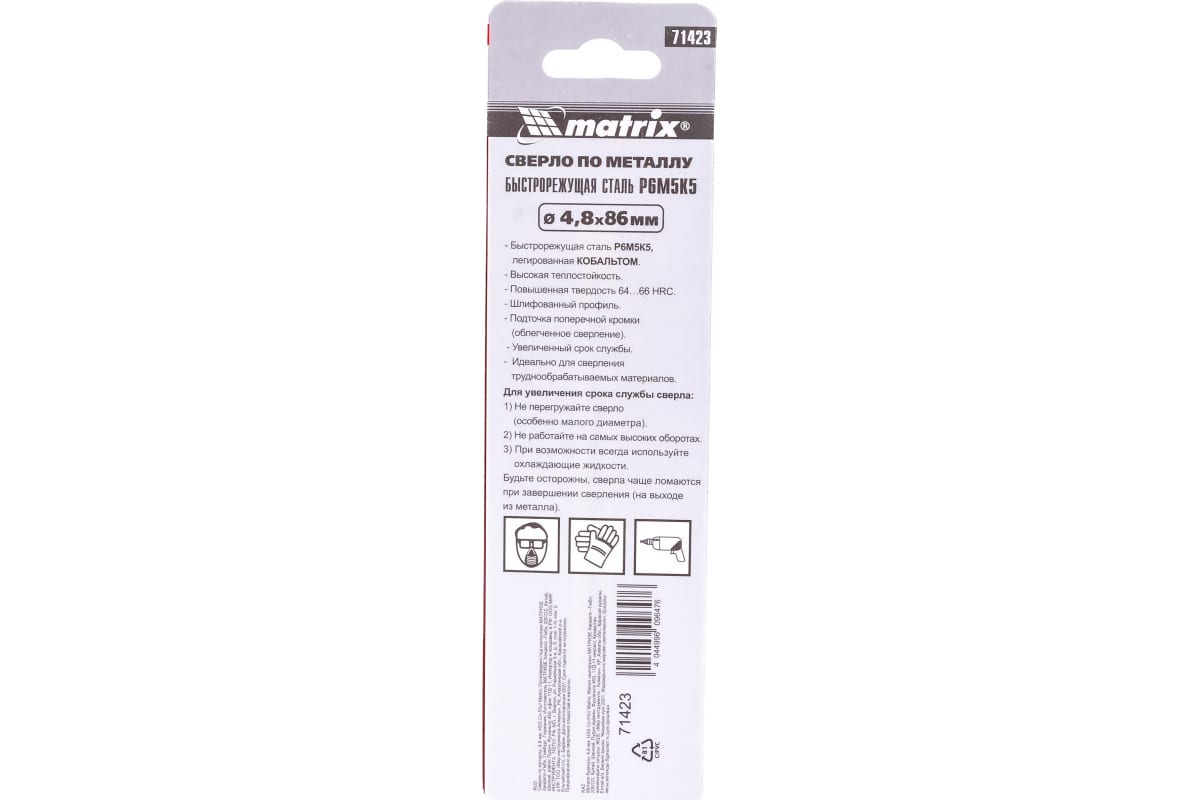 Преимущества сверла по металлу MATRIX 71423- Стойкость к износу и перегреву — сверло выполнено методом вышлифовывания профиля из качественной быстрорежущей стали с 5% содержанием кобальта и имеют увеличенную сердцевину