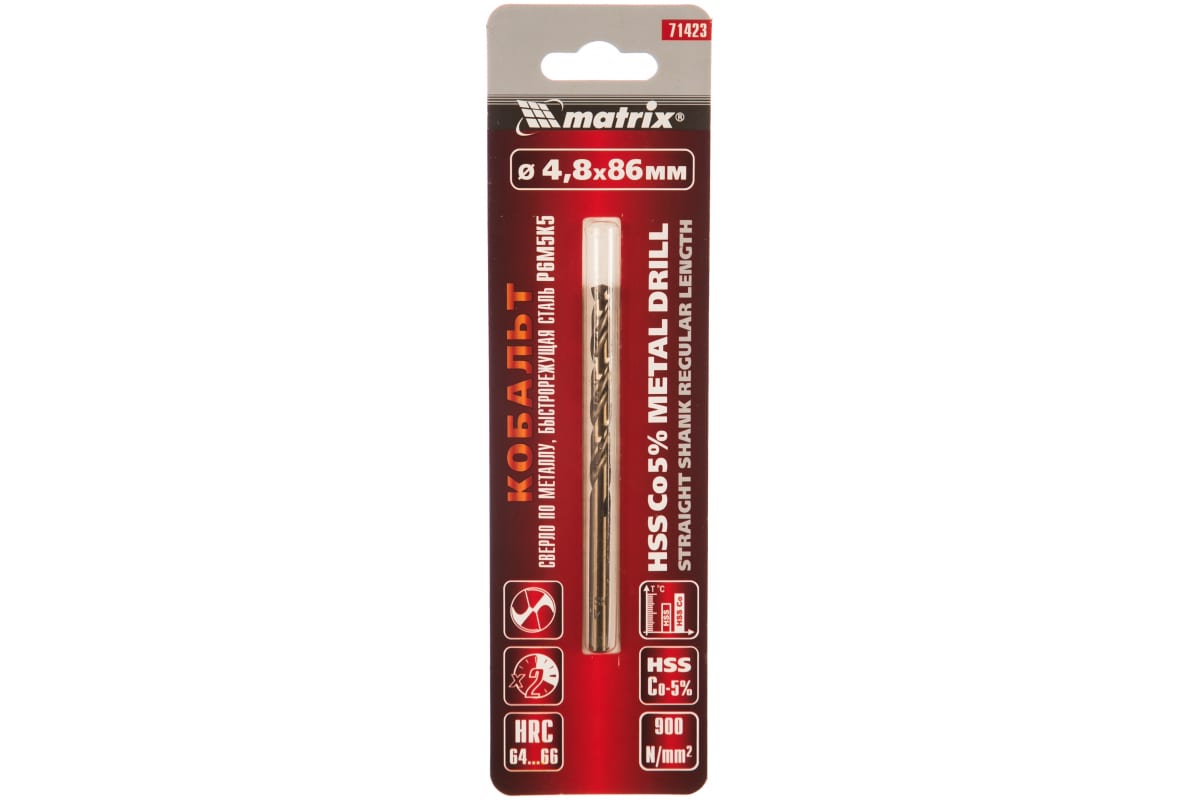 Сверло Matrix 71423 диаметром 4,8 мм, из стали HSS Co-5%, имеет угол заточки 135 градусов, оптимальный для сверления легированных и цветных металлов. Подходит для профессионального использования на строительной площадке.