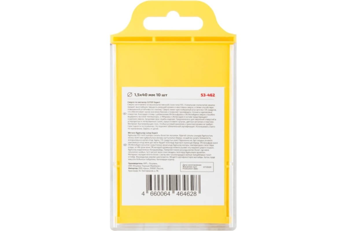 Сверло по металлу EXPERT 10 шт, 1.5x40 мм CUTOP 53-462 предназначено для сверлений отверстий в углеродистых и легированных сталях, серых и ковких чугунах, цветных металлах и пластике.