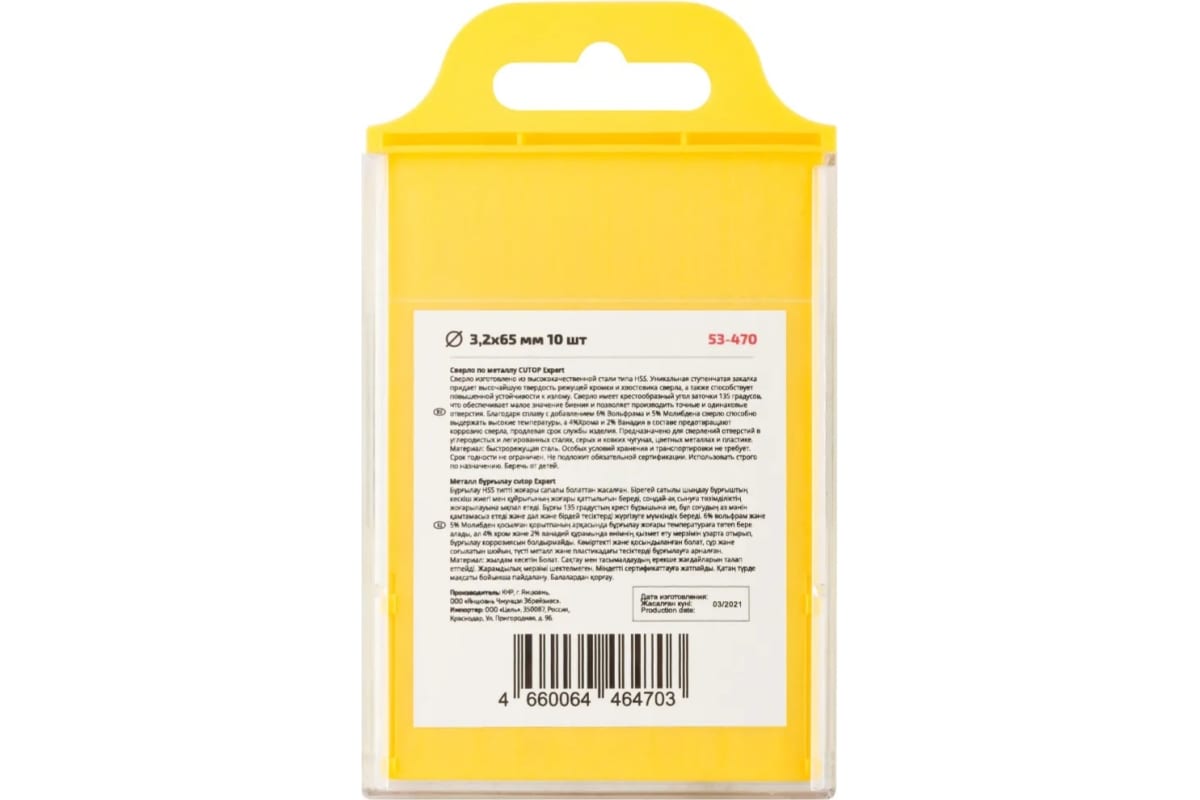 Сверло по металлу EXPERT 10 шт, 3.2x65 мм CUTOP 53-470 предназначено для сверлений отверстий в углеродистых и легированных сталях, серых и ковких чугунах, цветных металлах и пластике.