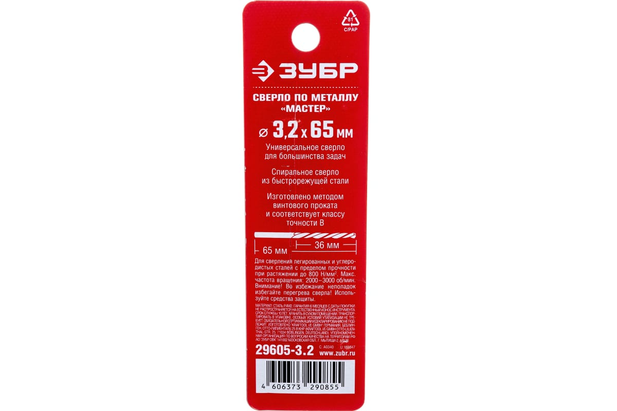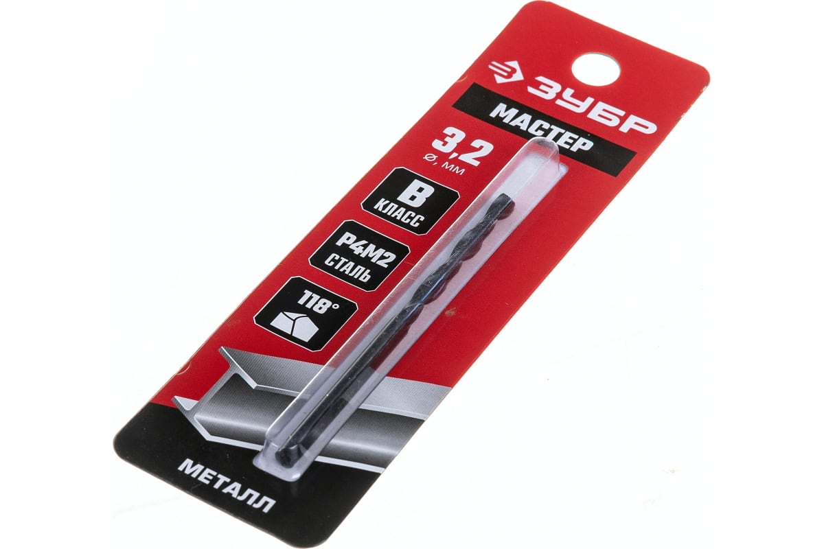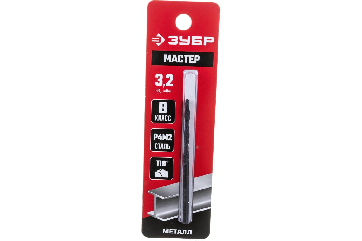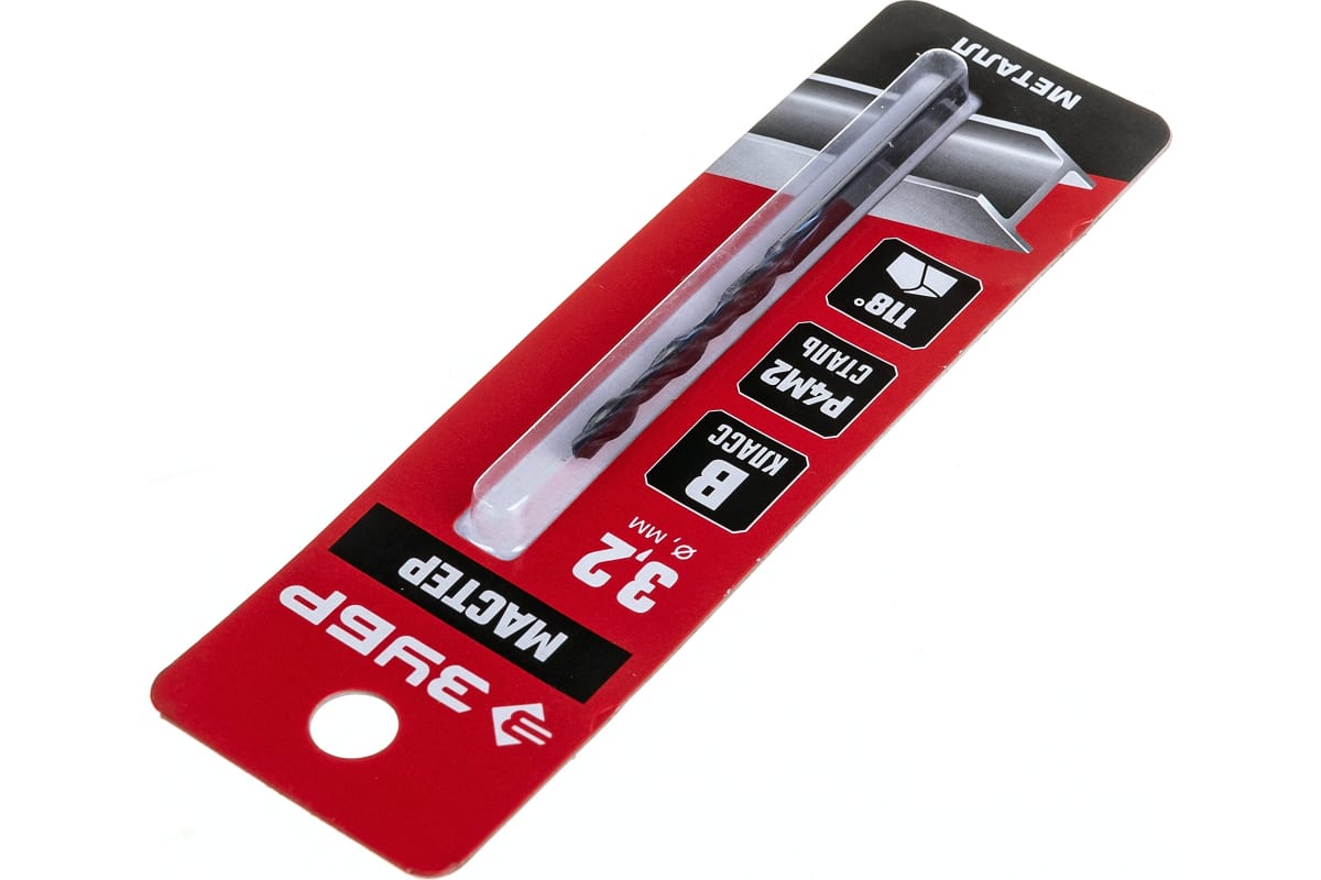 Сверло ЗУБР 29605-3.2, предназначено для обработки легированных и углеродистых сталей, цветных металлов, серого чугуна и пластмассы. Универсальное сверло для большинства задач. Изготовлено методом винтового проката по ГОСТ 10902-77 и соответствует классу точности "В". Угол заточки 118 градусов позволяет обрабатывать легированные и углеродистые стали.