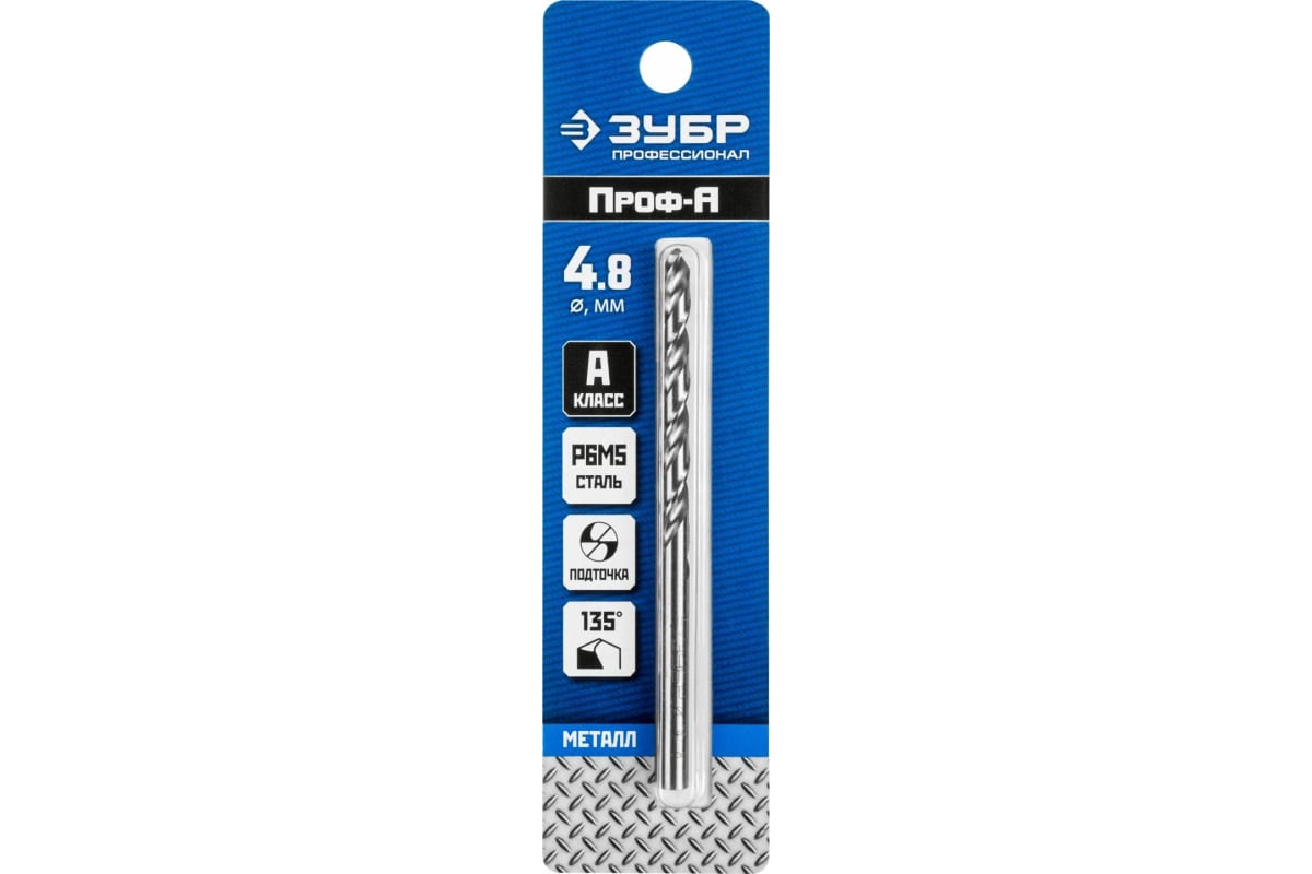 Сверло ЗУБР 29625-4.8, предназначено для обработки легированных и углеродистых сталей с пределом прочности до 900 Н/мм², цветных металлов, серого чугуна и пластмассы. Качественное и точное сверло с большим ресурсом. Сверло изготовлено методом шлифования профиля по ГОСТ 10902-77 и соответствует классу точности сверления "А1". Крестообразная подточка позволяет начать сверлить без предварительного кернения. Угол заточки при вершине равный 135° повышает производительность работ.