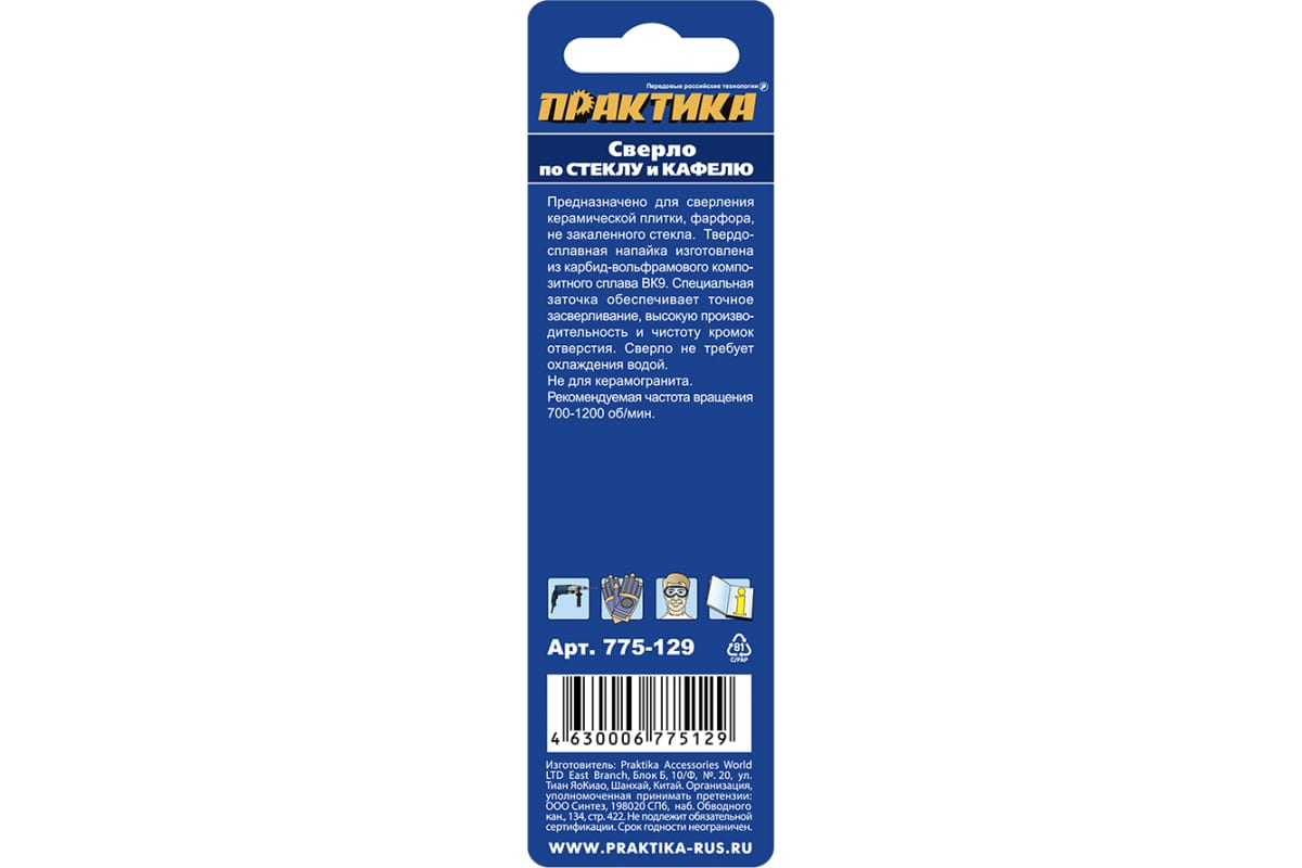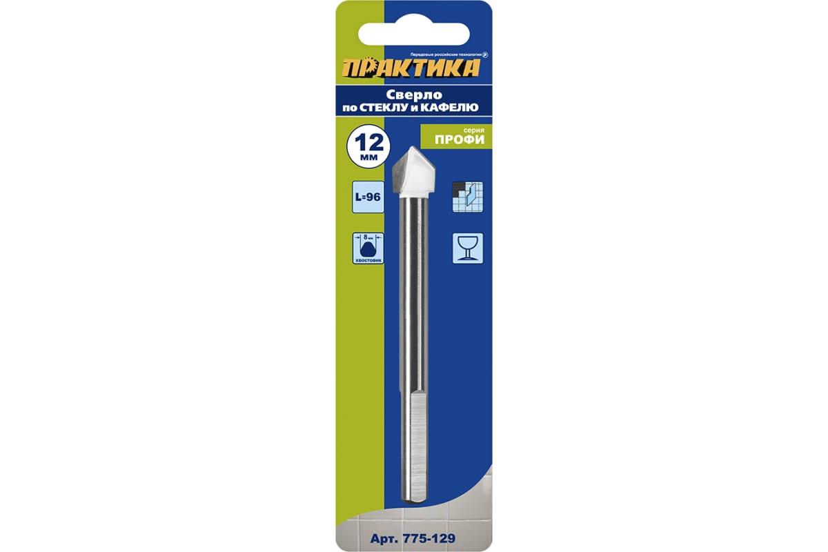Сверло по стеклу и кафелю Профи V-тип (12х96 мм) ПРАКТИКА 775-129 предназначено для сверления керамической плитки, фарфора, не закаленного стекла.