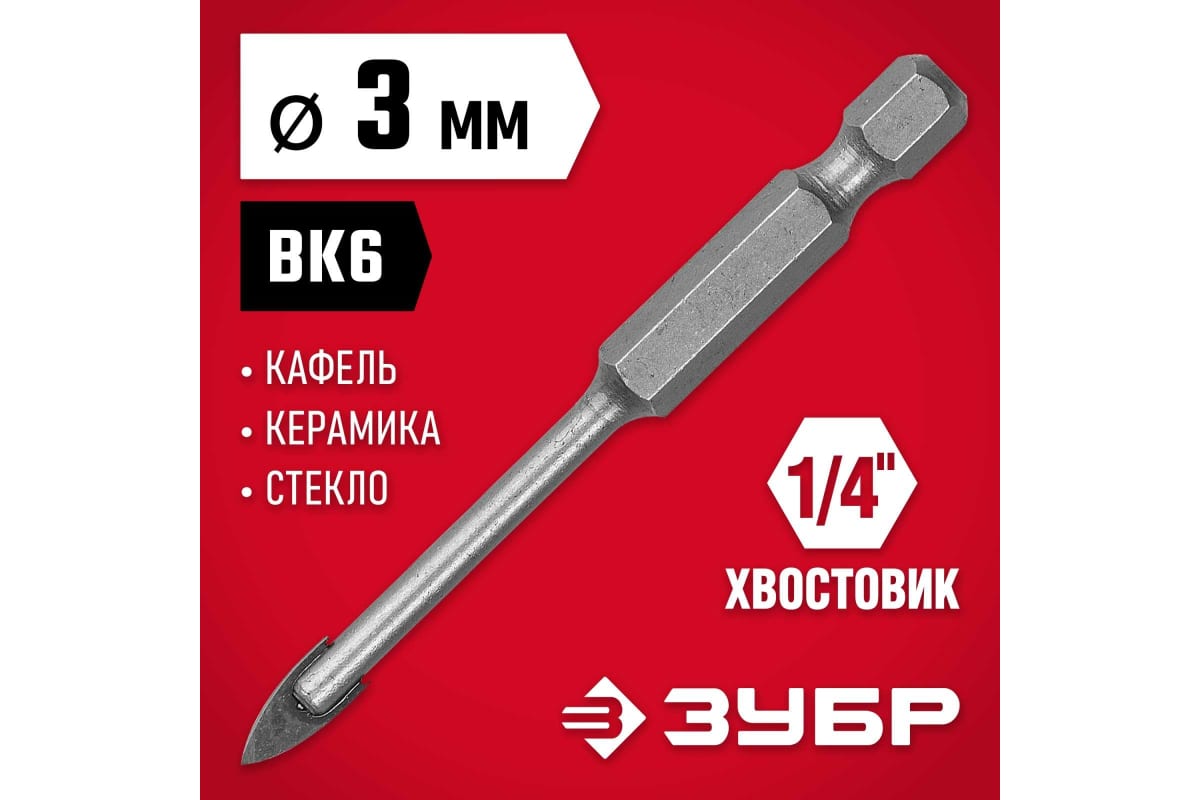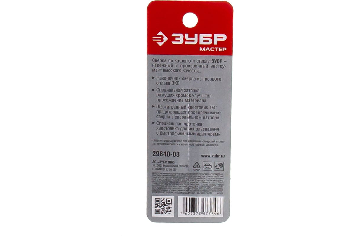 Сверло "МАСТЕР" (3 мм) по кафелю Зубр 29840-03 используется для сверления отверстий в кафеле, керамике и стекле с помощью электродрели. Оснастка имеет шестигранный хвостовик для надежной фиксации в патроне, а также твердосплавные пластины ВК6 с отшлифованными режущими кромками для эффективной работы. Сверло имеет два режущих лезвия. Используется с дрелями и шуруповертами в режиме безударного сверления. Благодаря специальной проточке хвостовика 1/4 дюйма возможно использование с быстросъёмным адаптером. Применение охлаждающей жидкости при сверлении значительно продлевает срок службы инструмента. Необходимо избегать перегрева сверла.