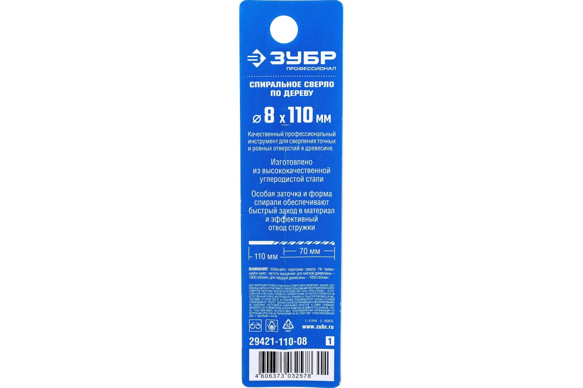 Сверло спиральное по дереву, М-образная заточка Профессионал Зубр 29421-110-08_z01 предназначено для электродрелей и шуруповертов. Применяется для выполнения глухих и сквозных отверстий в древесине, фанере, ДСП, клееных щитах и пластмассе.