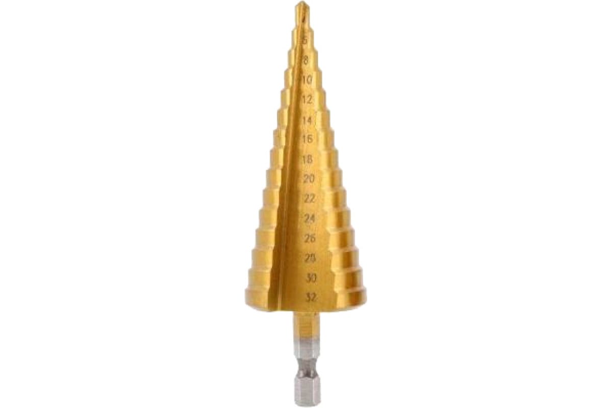 Сверло имеет 15 ступеней с шагом 2 мм: 4, 6, 8, 10, 12, 14, 16, 18, 20, 22, 24, 26, 28, 30, 32 мм.