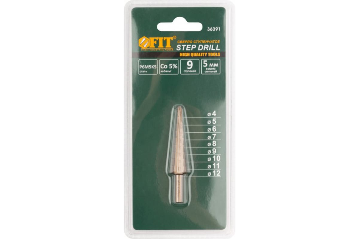 Сверло ступенчатое FIT 36391 предназначено для сверления и рассверливания отверстий разного диаметра в листовой стали, цветных металлах и твердом пластике. Для удобства и точности сверления на корпусе указаны диаметры сверла.