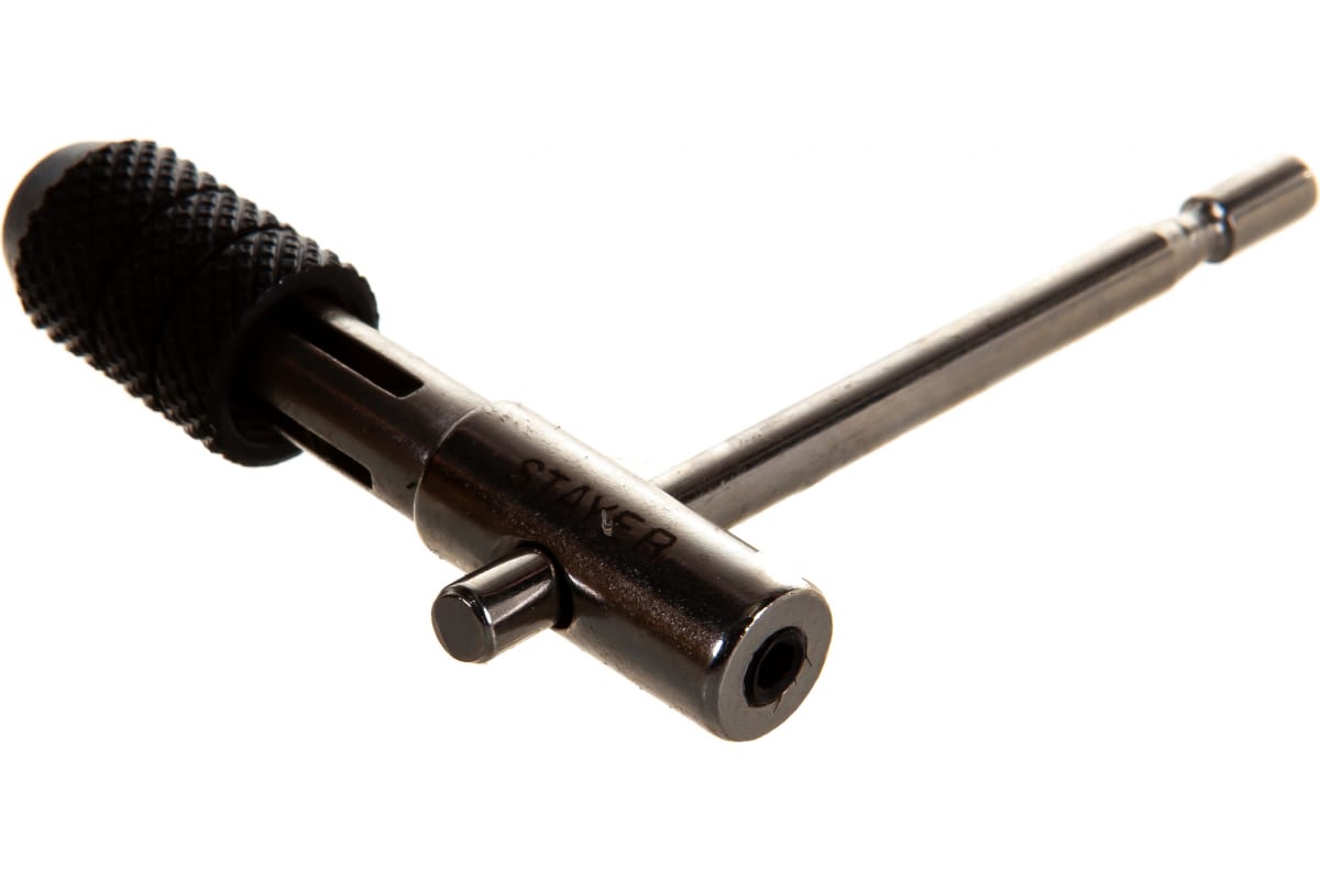 Т-образный метчикодержатель Stayer №2, М3-М6, Professional 28039-T2_z01 оснащен скользящим воротком, который упрощает вращение инструмента. Это позволяет работать с небольшими усилиями и точно выставлять направление движения.