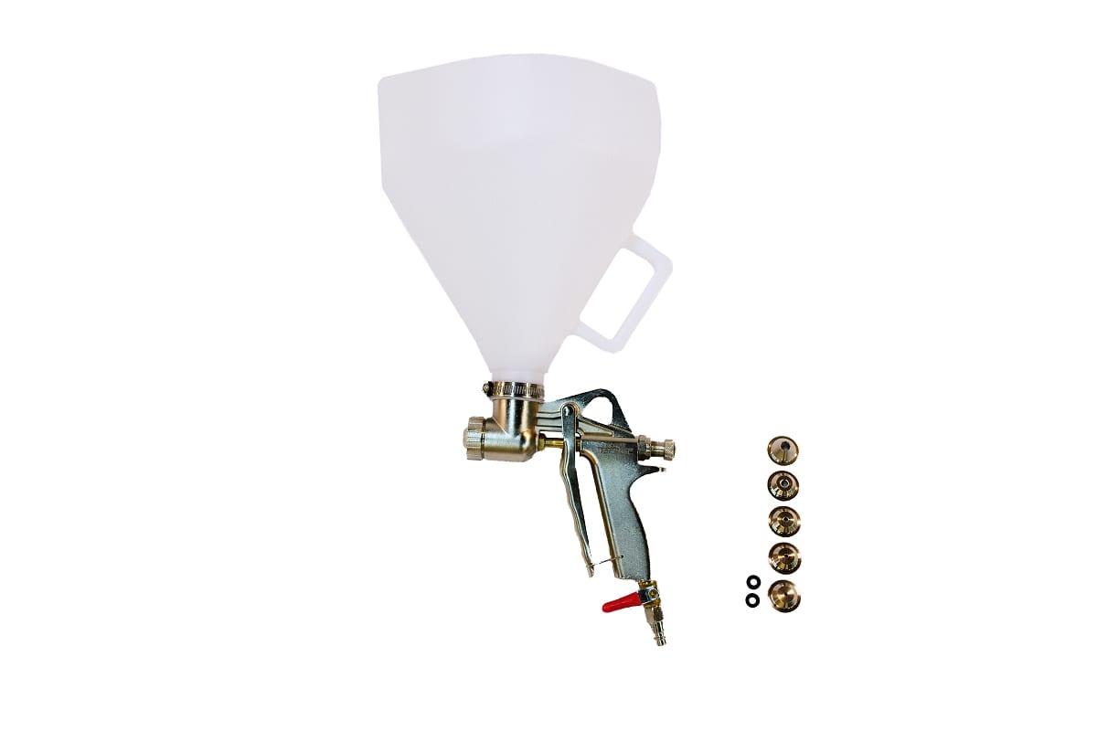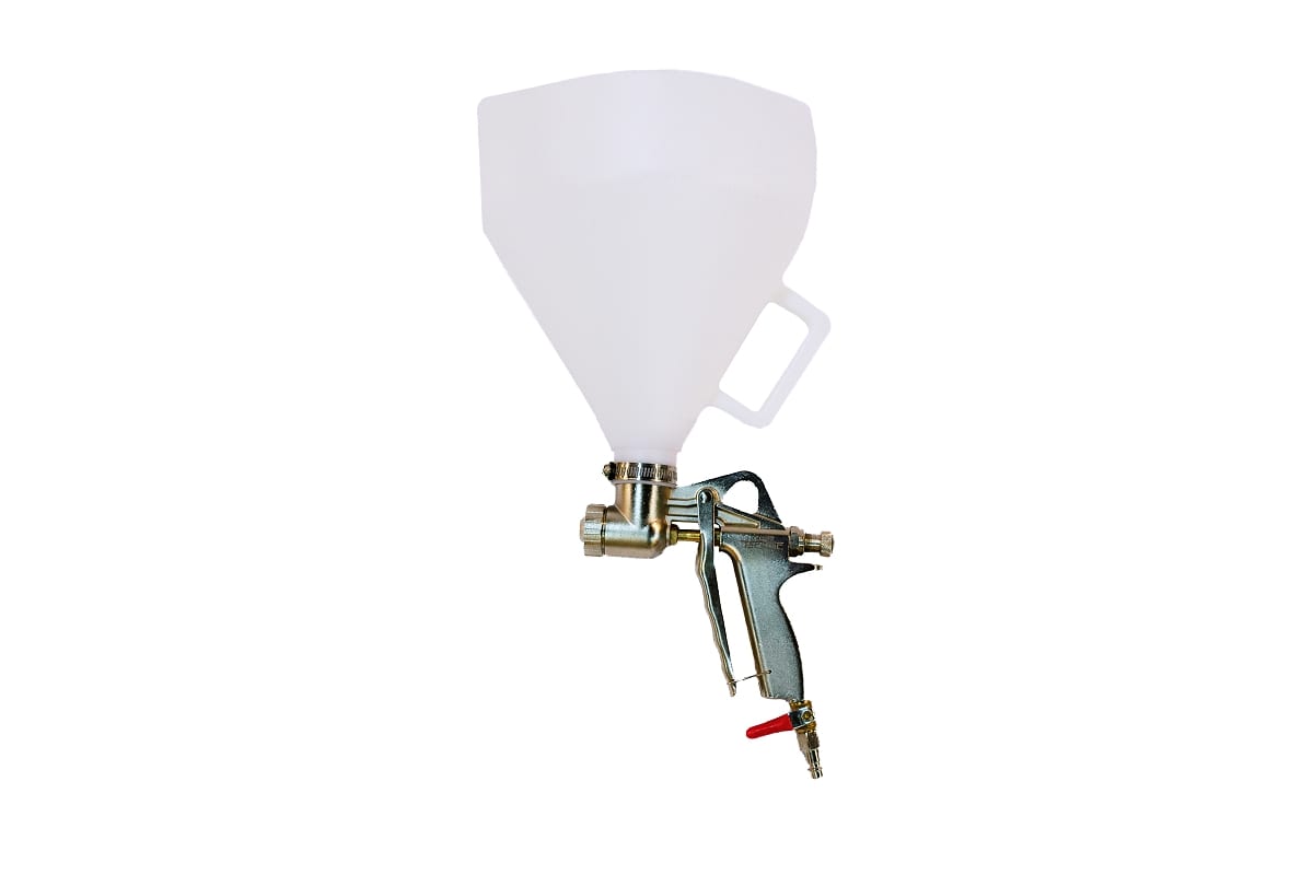 Текстурный картушный пневмопистолет POWER TECHNIC RK-1CR подходит для быстрой обработки больших поверхностей. Слой штукатурки с его помощью получается плотным, без пор и полостей, так как смесь наносится под большим давлением.