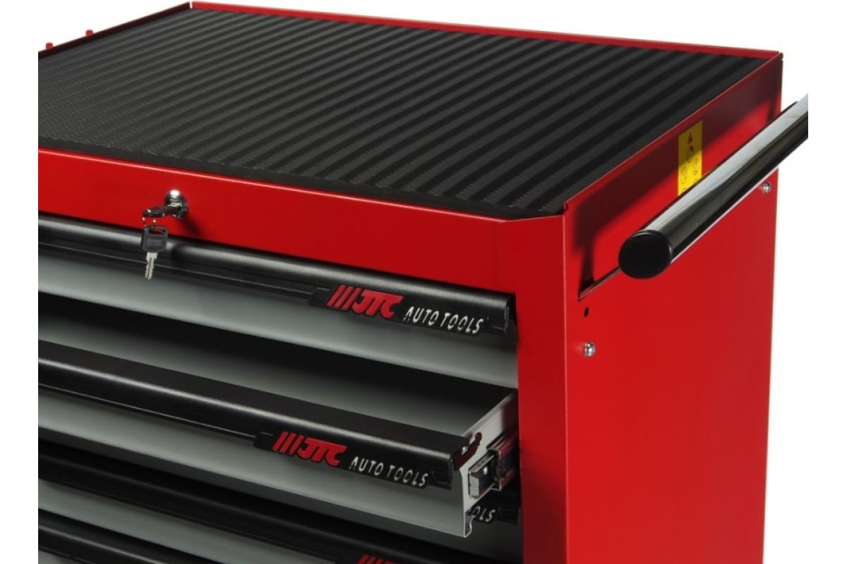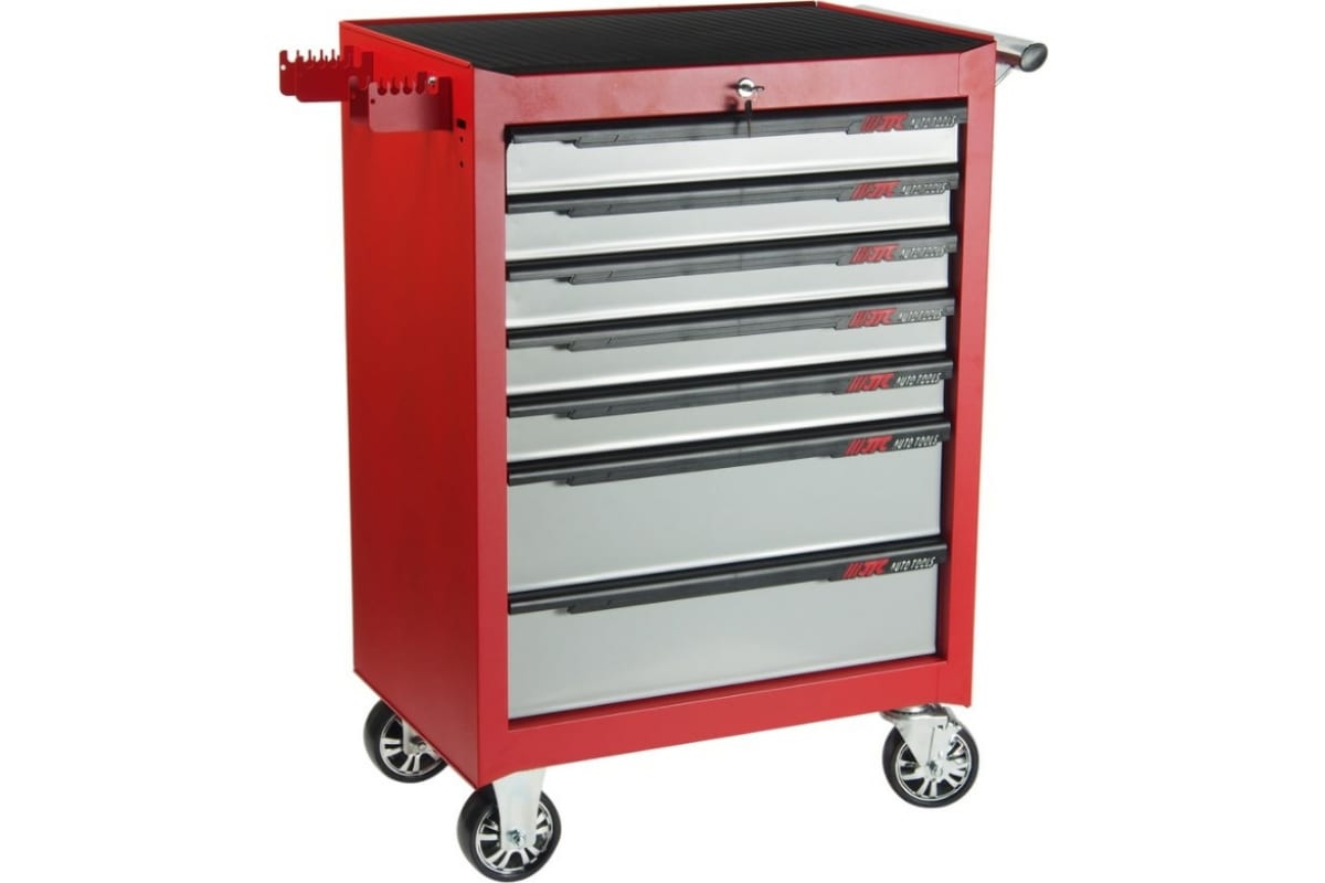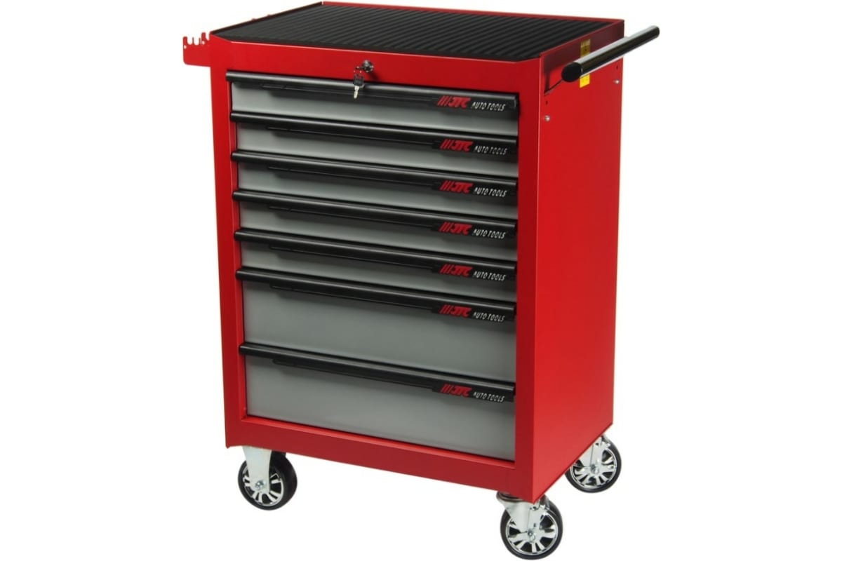 Тележка инструментальная (7 секций, красная, на колесах) JTC 3931C - система закрытого хранения инструмента и крепежа. Изделие подойдет для автомастерских и для собственного гаража. Наличие семи ящиков различного объема позволяет систематизировать хранение и сделать его более понятным и удобным. Верхняя полка покрыта специальным защитным материалом. В верхней части есть транспортировочная рукоятка и крючья для подвешивания инструмента. Поворотные колеса упрощают эксплуатацию тележки.