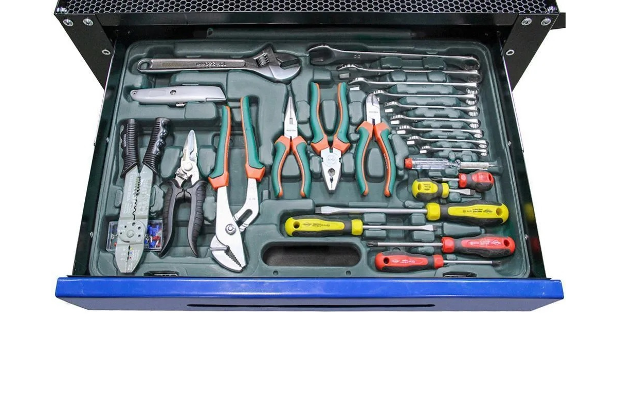Конструкция тележки выполнена из листовой стали. Окрашена порошком и имеет высокую прочность. Благодаря этому она легко выдерживает нагрузку в виде набора инструмента.