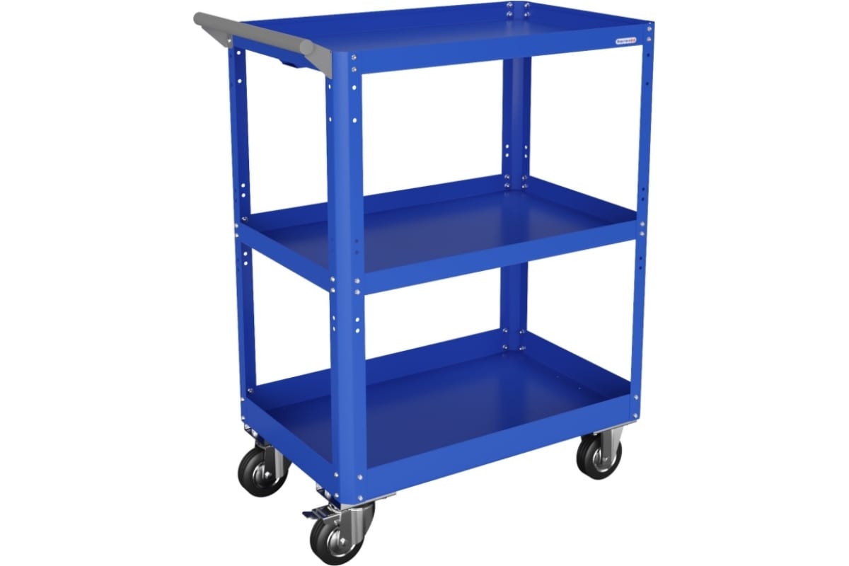 Общая равномерно-распределённая нагрузка на тележку - до 100кг. Корпус выполнен из листовой стали толщиной от 0,6 до 1,5мм., покрыт полимерной порошковой краской. Верхняя и средняя полка имеют высоту борта 40мм., нижняя полка имеет высоту борта 60мм.