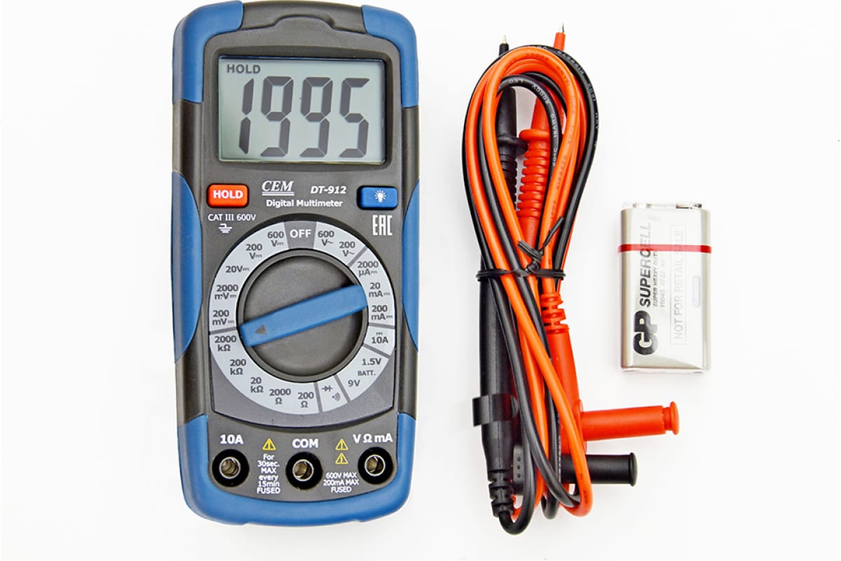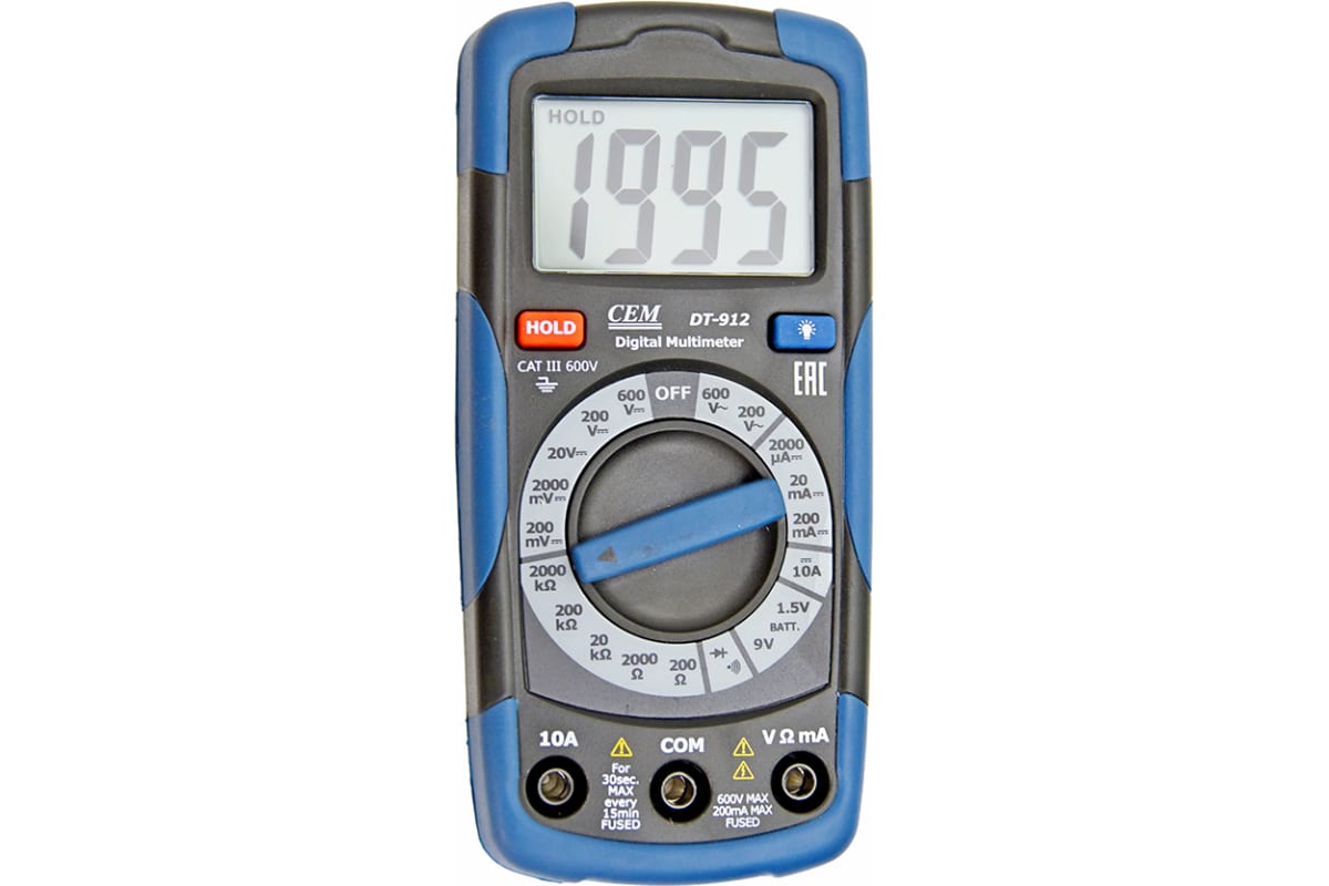 Тестер-мультиметр СЕМ DT-912 480960 - прибор бытового класса для прозвонки цепей, тестирования диодов, измерения напряжения и силы тока. Модель защищена от перегрузок в соответствии с EN61010-1 CAT III 600V, CAT II 1000V. Поворотная рукоять с размеченной круговой шкалой обеспечивает простое и интуитивно понятное управление измерительным прибором. Показания замеров отображаются на цифровом дисплее.