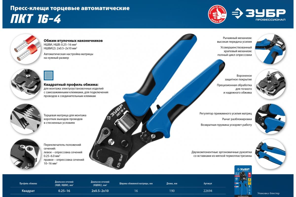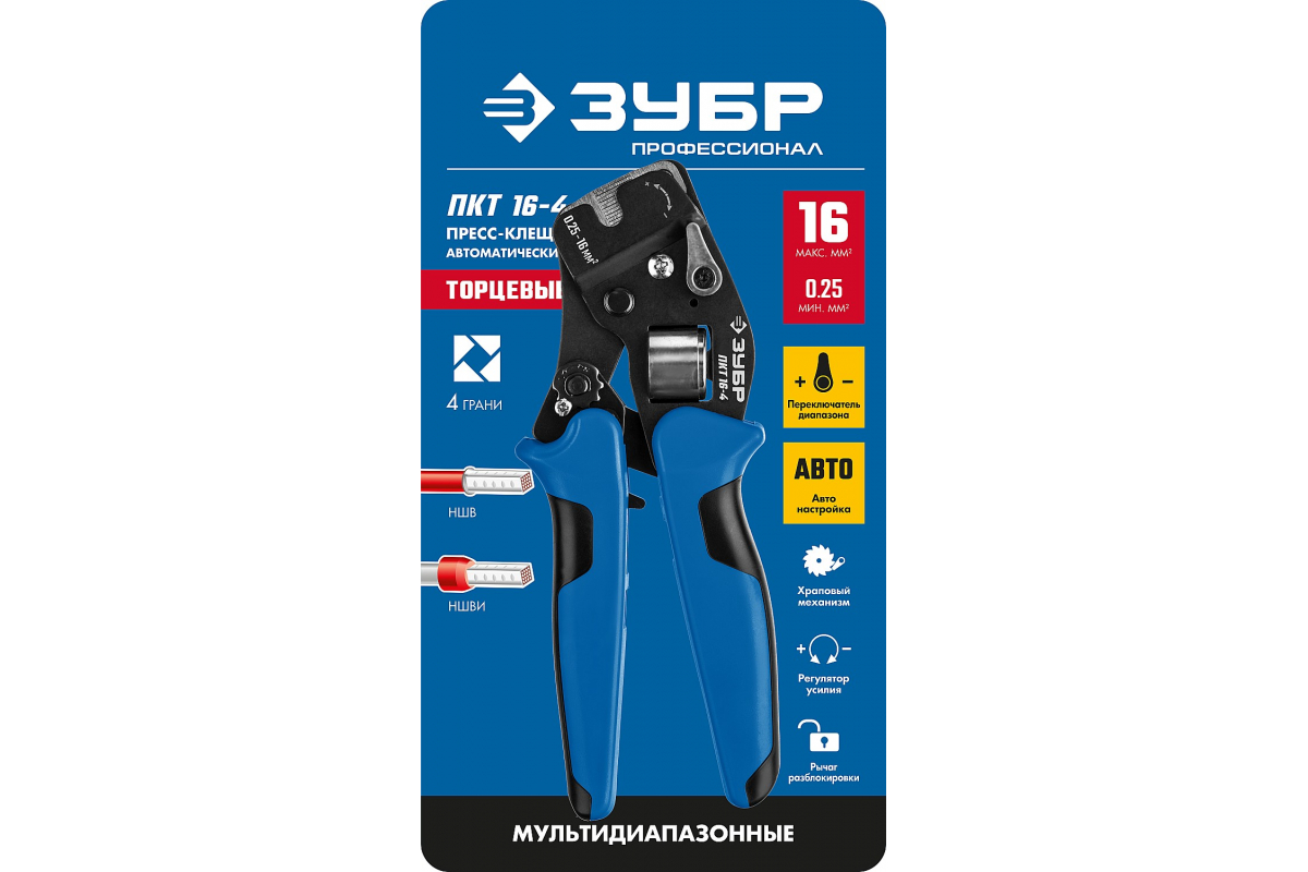 Торцевые пресс-клещи для втулочных наконечников ЗУБР ПКТ-16-4 0.25 - 16 мм.кв, 22694 выполнены из высококачественной стали с закалкой рабочих поверхностей. Инструмент подходит для профессионального применения.