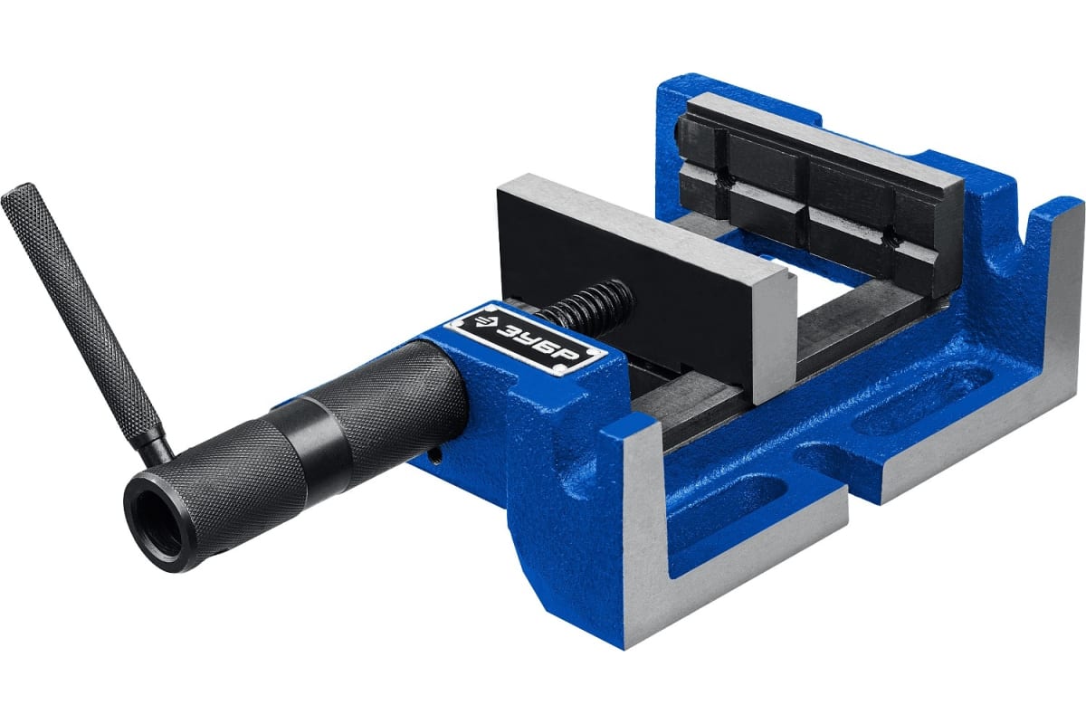 Призматические пазы неподвижной губки позволяют зажимать горизонтально и вертикально цилиндрические заготовки.