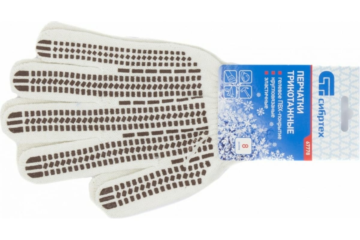 Трикотажные перчатки Сибртех 67778 с рисунком из ПВХ-геля «Протектор», обработанные оверлоком, предназначены для защиты рук от травм и загрязнений. Тонкое полотно 10 класса вязки сохраняет чувствительность пальцев, необходимую для выполнения точных работ.