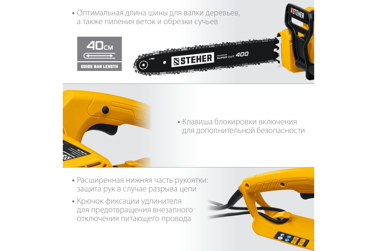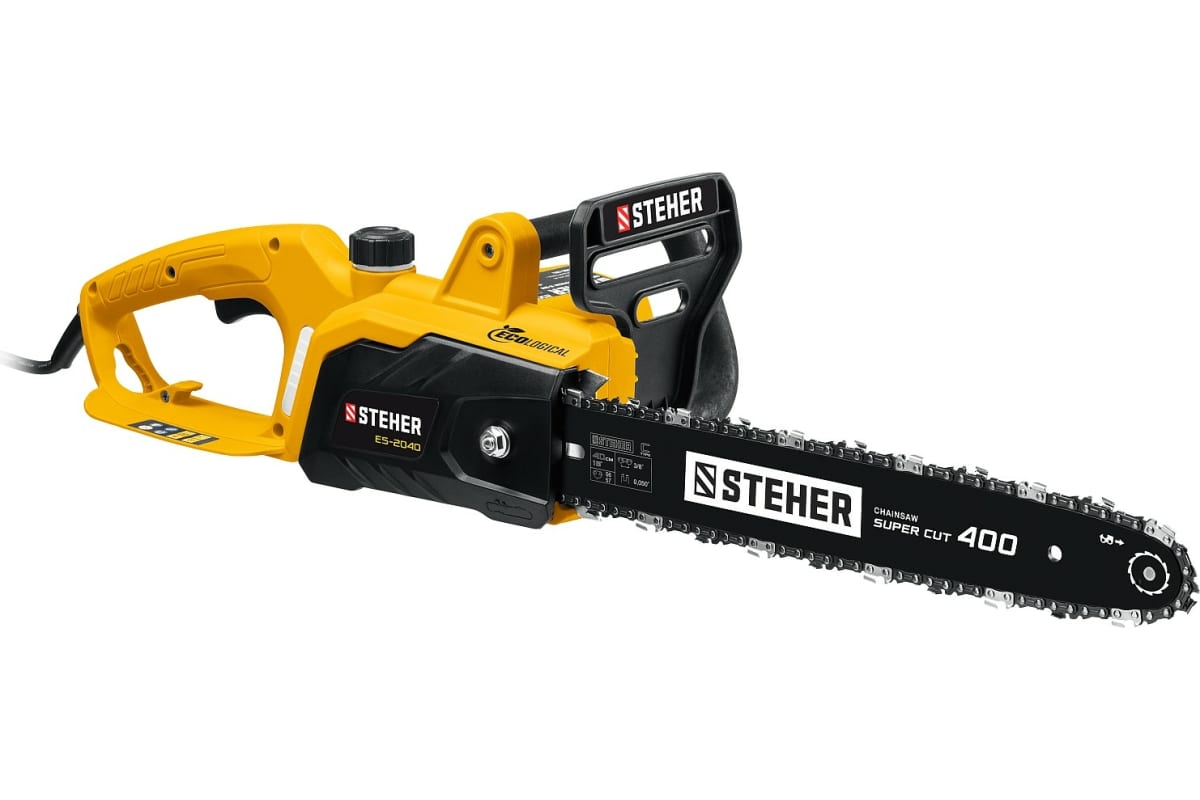 Цепная электрическая пила STEHER 2000 Вт ES-2040 применяется для валки деревьев, а так же пиления веток, обрезки сучьев, пиления деревянных балок, досок и тому подобное.