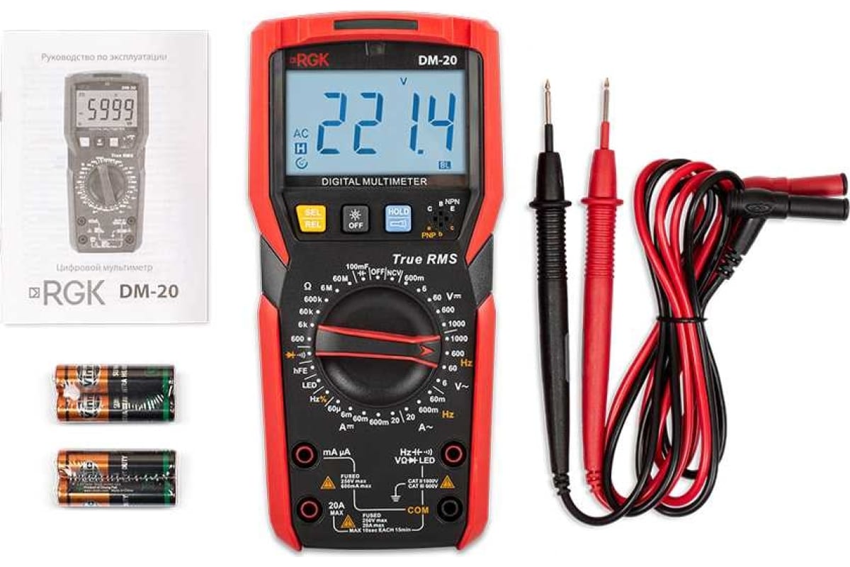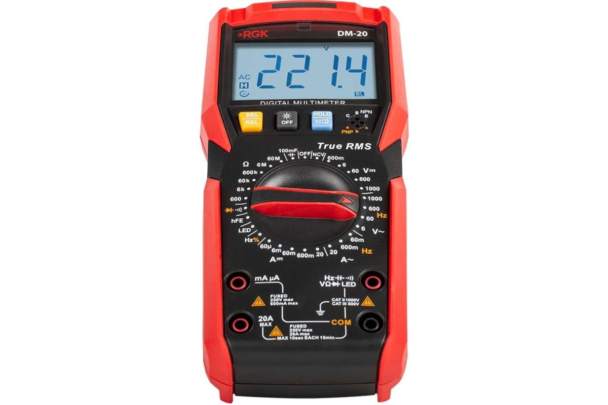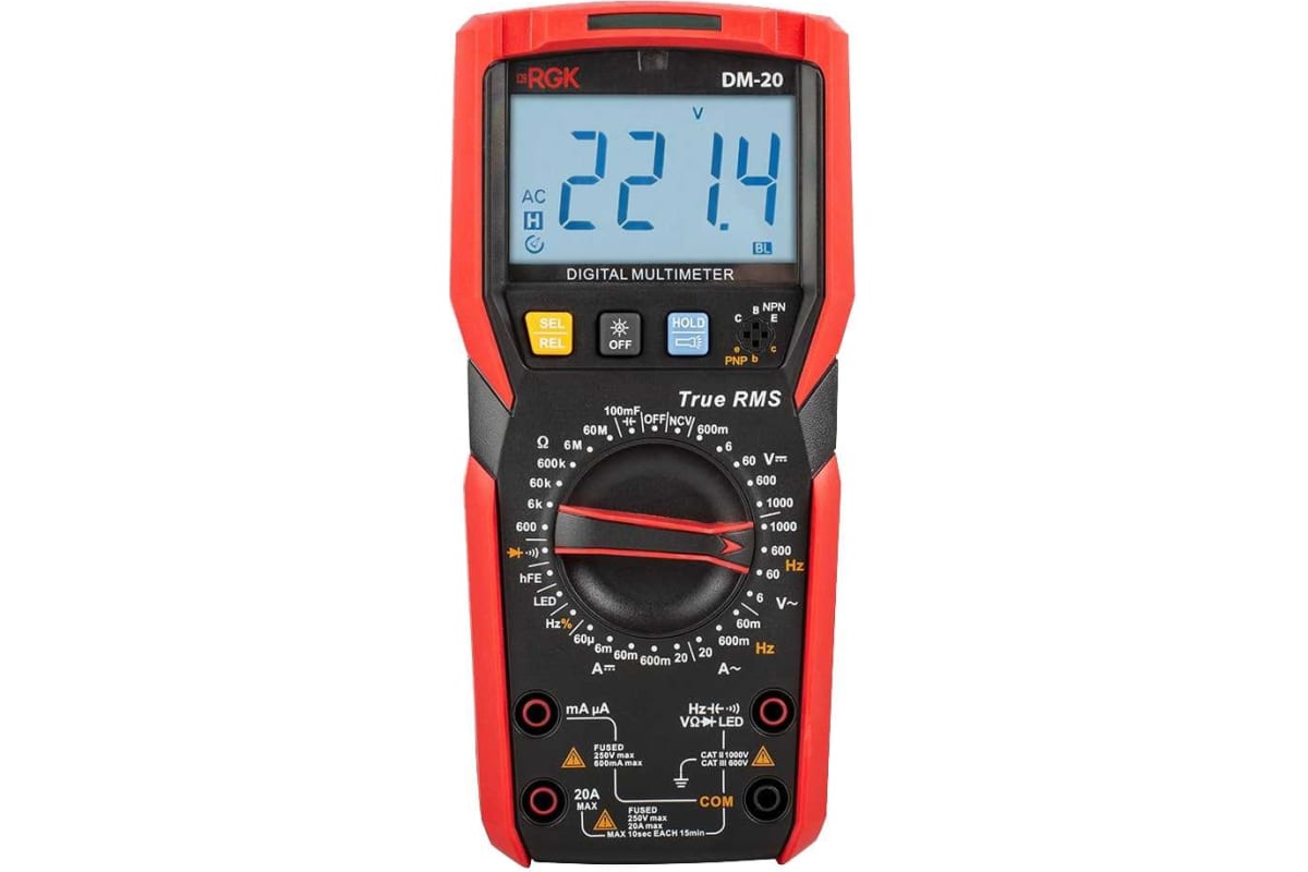 Цифровой мультиметр RGK DM-20 - это надежный и безопасный прибор для измерения целого ряда параметров электросетей и оборудования, прозвонки цепей, тестирования различных компонентов электроприборов. Благодаря широкому арсеналу функций и измерительных режимов эта портативная модель может использоваться как в быту, так и в таких профессиональных отраслях, как строительство, сервисное обслуживание и др.