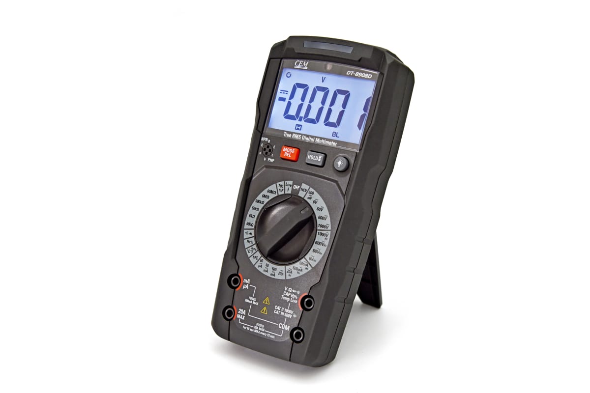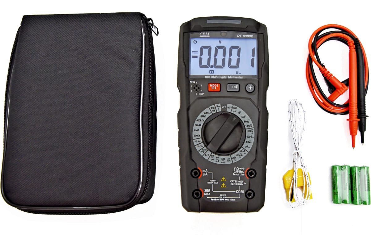 - Уникальная функция звуковой и световой сигнализации реализована в режимах измерения напряжения, тока, проверки диодов, контроля на обрыв, измерения емкости, проверки транзисторов, NCV и Live.