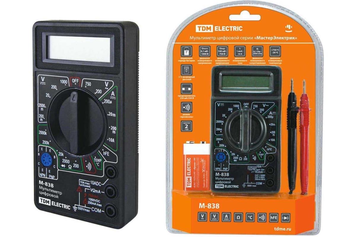 Цифровой мультиметр TDM МастерЭлектрик М-838 SQ1005-0003 позволит измерить напряжение, силу постоянного тока, сопротивление и температуру. Щупы и батарейка в комплекте делают прибор полностью готовыми к работе