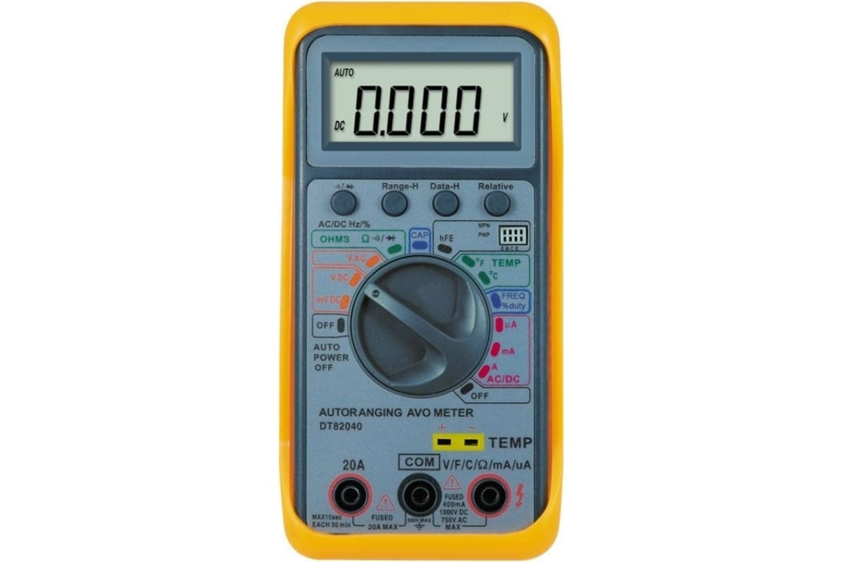 Мультиметр DT-82040 предназначен для измерения постоянного и переменного напряжения, постоянного тока, сопротивления, проверки диодов, транзисторов, прозвонки соединений, а также для измерения температуры.