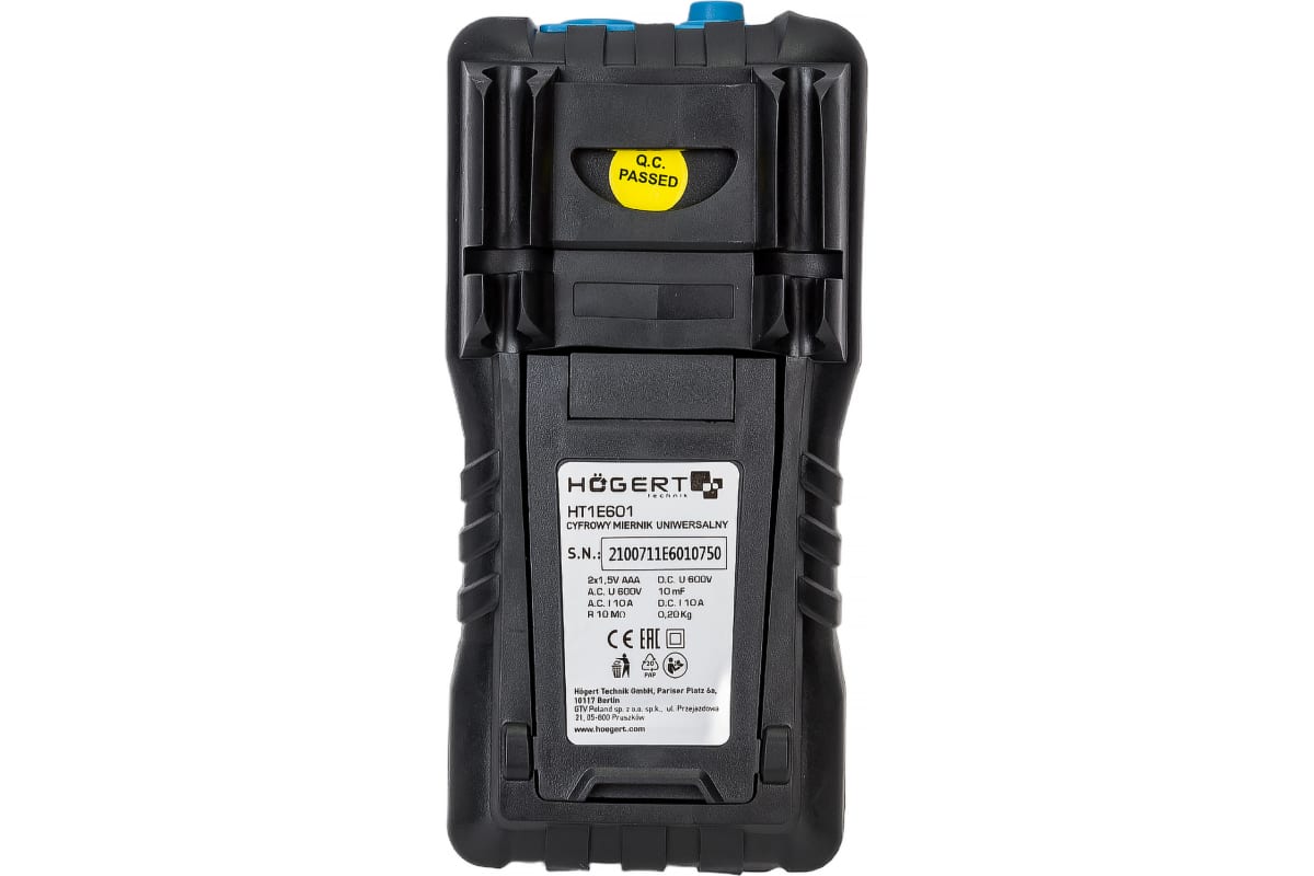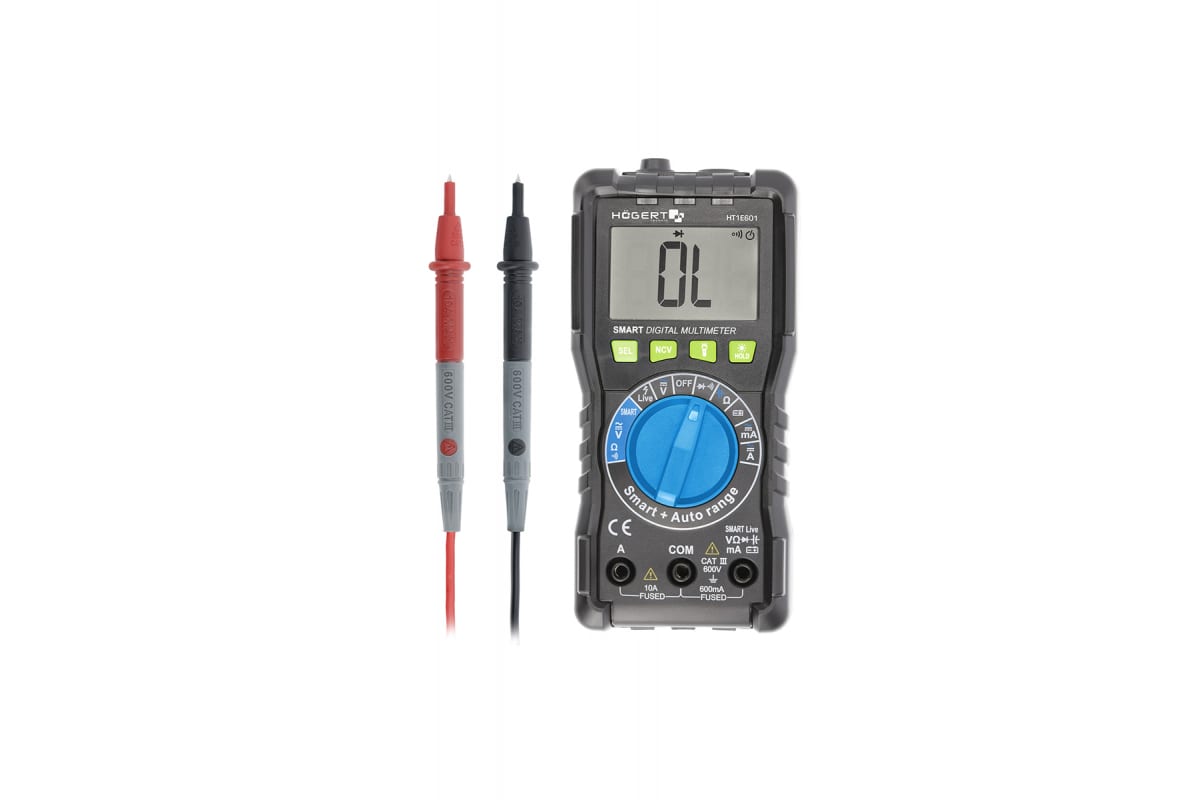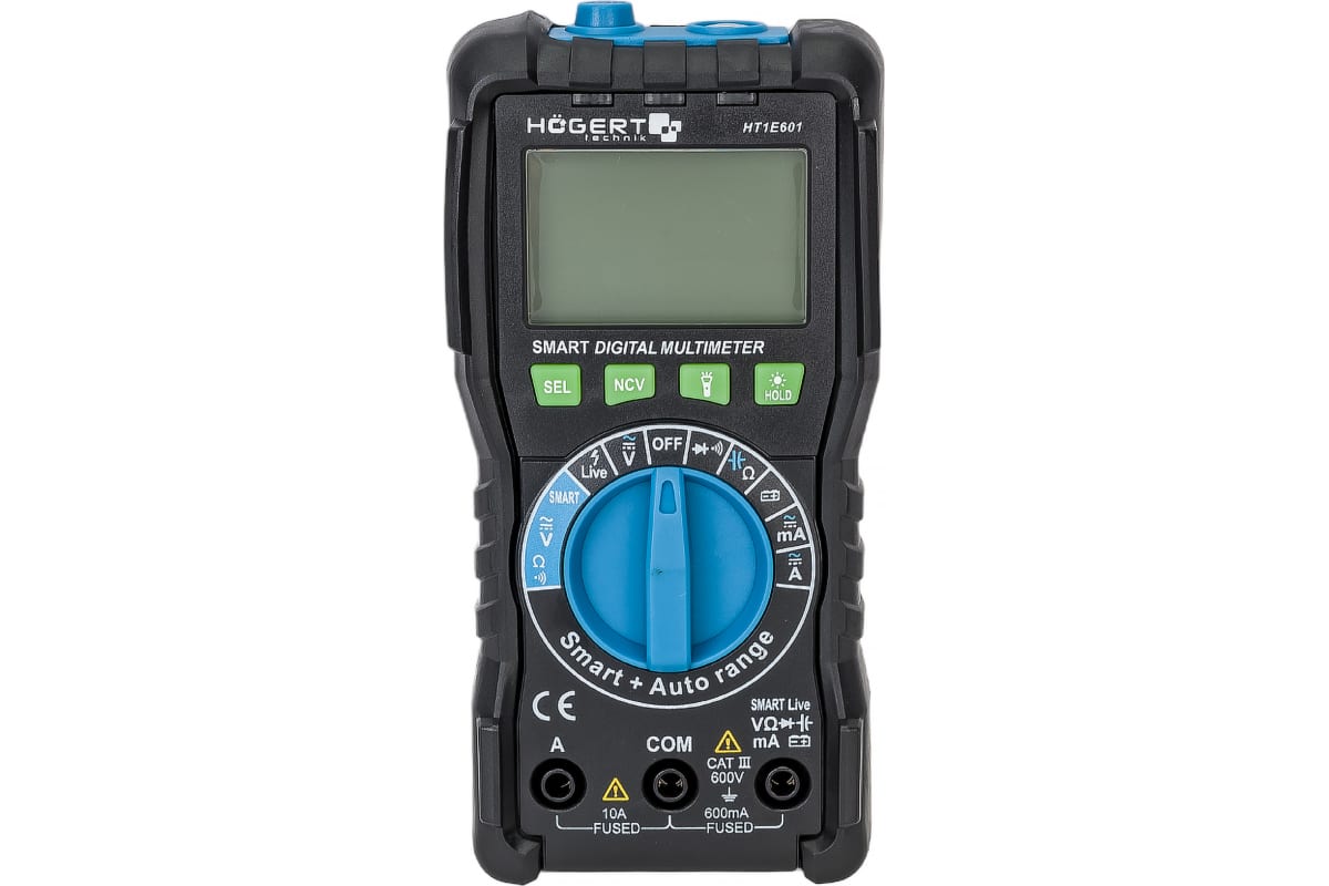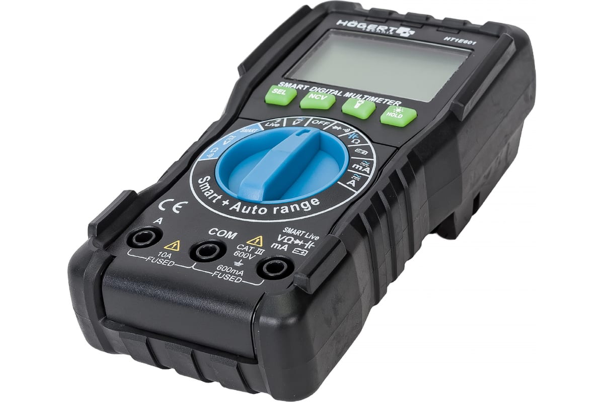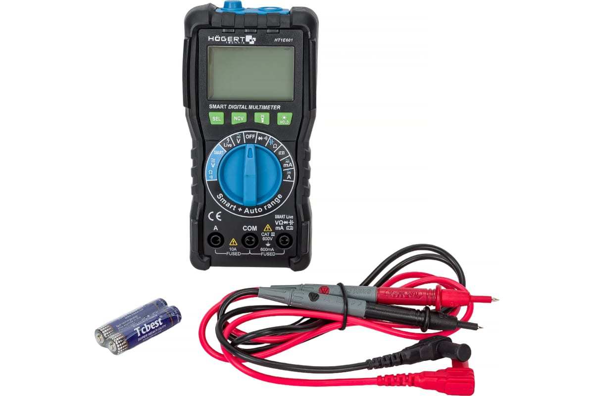 Цифровой профессиональный мультиметр HOEGERT TECHNIK с технологией SMART HT1E601 используется в промышленной сфере, при ремонте электротехники электроники. С его помощью можно измерить напряжение, силу тока, емкость, сопротивление, частоту, а также произвести проверку аккумуляторов 1.5 и 9 В.