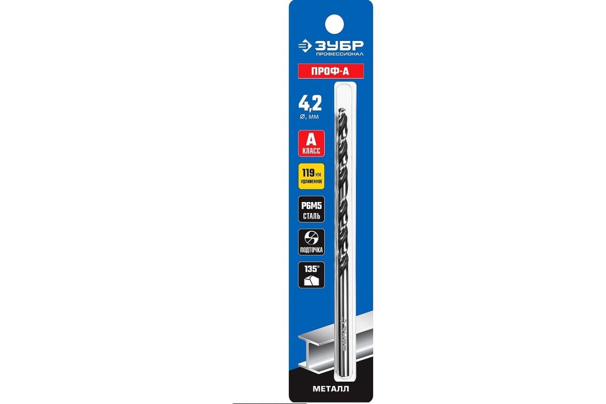 Сверло ЗУБР 29624-4.2, предназначено для сверления металлических конструкций и заготовок. Применяется с шуруповертами и электродрелями. Сверло изготовлено из быстрорежущей стали Р6М5, что обеспечивает высокую стойкость рабочей кромки даже в условиях высоких нагрузок. Сверло по металлу обладает повышенной производительностью, имеет оптимальный угол заточки - 135гр, и выполнено по специальной технологии, разработанной специалистами компании.