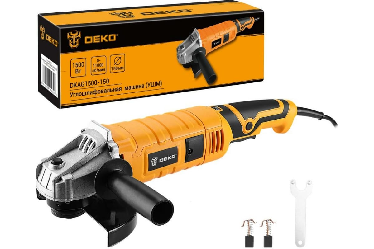 Углошлифовальная машина DEKO DKAG1500-150 применяется для обдирки, зачистки и шлифования металла и других материалов. Металлический корпус редуктора повышает надежность инструмента.