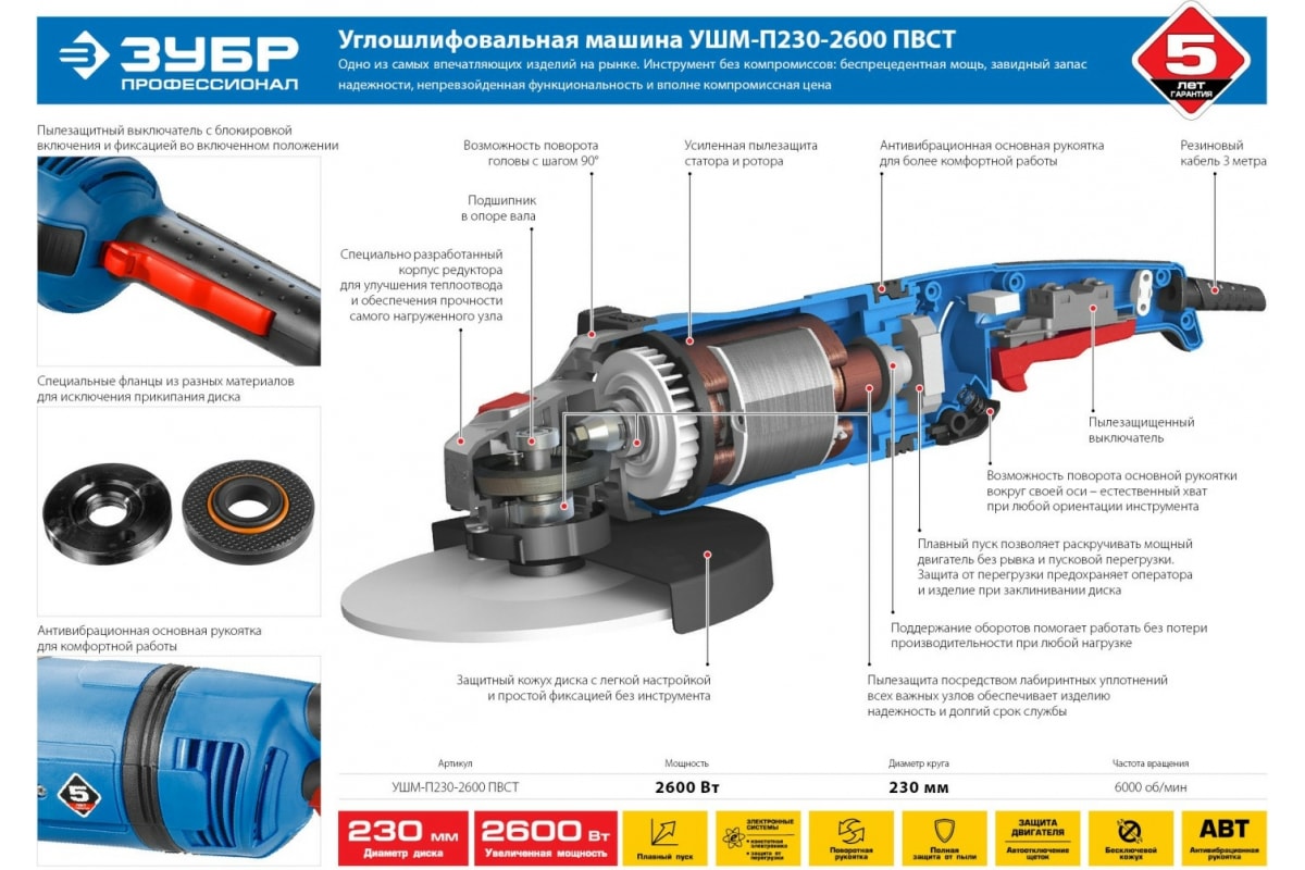 - Пылезащита - для долгого срока службы углошлифовальной машины Зубр ПРОФЕССИОНАЛ УШМ-П230-2600 ПВСТ;