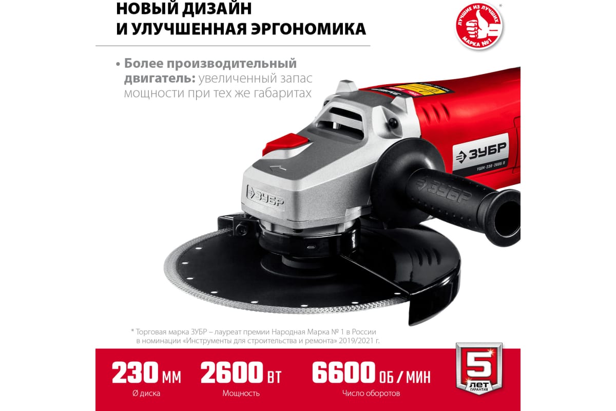 Преимущества ЗУБР УШМ-230-2605 П- Мощный инструмент ЗУБР УШМ-230-2605 П для требующих полной отдачи от инструмента