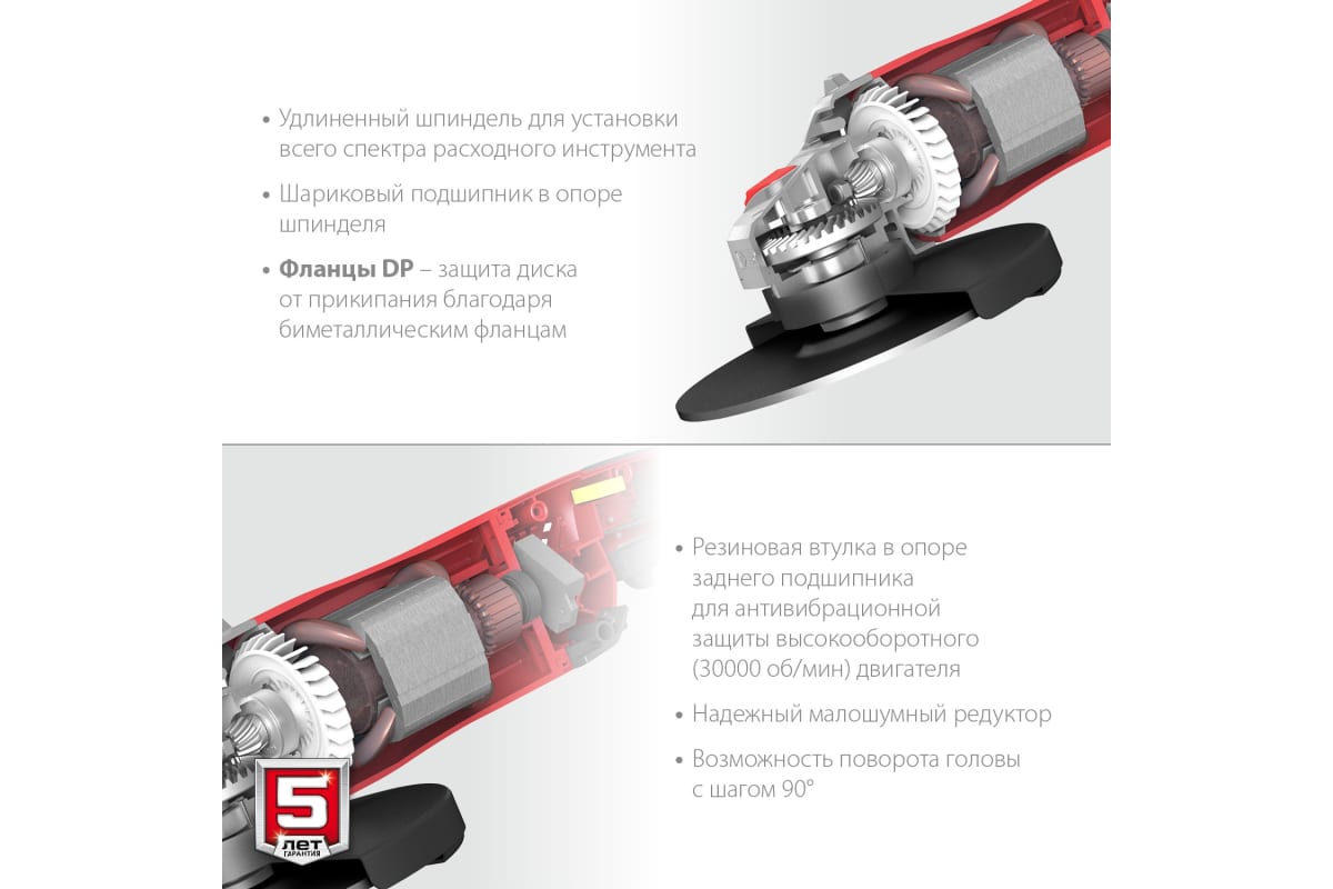 - Широкий эргономичный выключатель с пылезащитой, блокировкой непреднамеренного включения, а также фиксацией во включенном положении