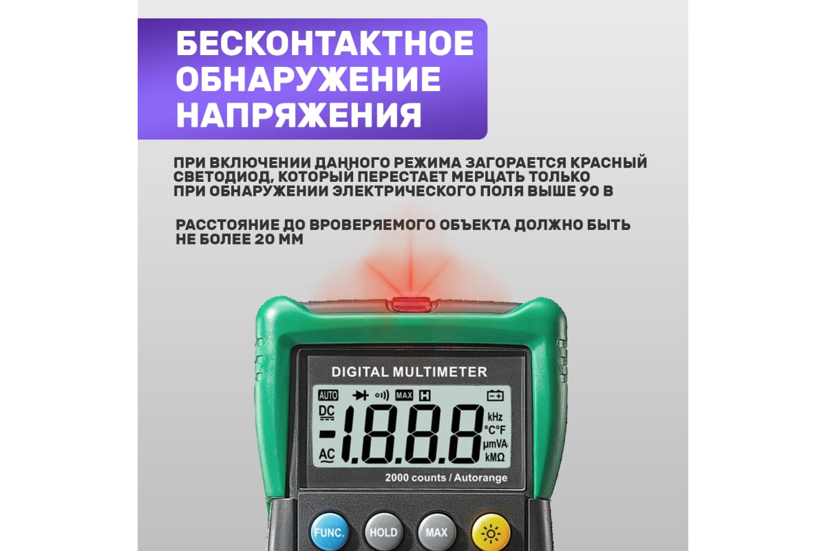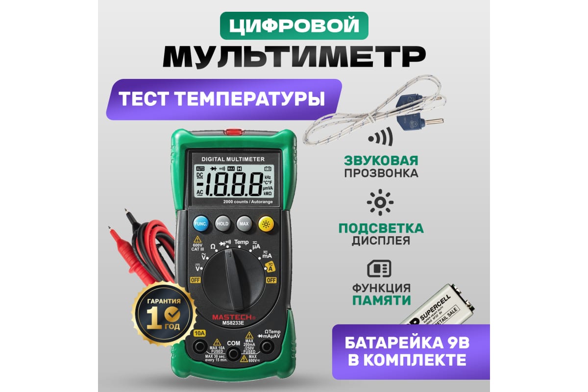 Мульти́метр — электроизмерительный прибор, который включает в себя несколько функций и набор измеряемых параметров. Все приборы серии MS8233 измеряют постоянное и переменное напряжение, а также постоянный и переменный ток, сопротивление в цепи и даже температуру. С помощью данного прибора можно проводить тестирование диодов и осуществлять прозвонку целостности цепи. Мультиметр MS8233E оборудован специальным датчиком, с помощью которого вы бесконтактно сможете определить, есть ли напряжение на участке, например в розетке, если есть необходимость демонтировать ее, то с помощью данного мультиметра вы сможете сразу узнать, если ли в ней напряжение. Таким образом, один прибор сможет заменить сразу несколько устройств одновременно.
