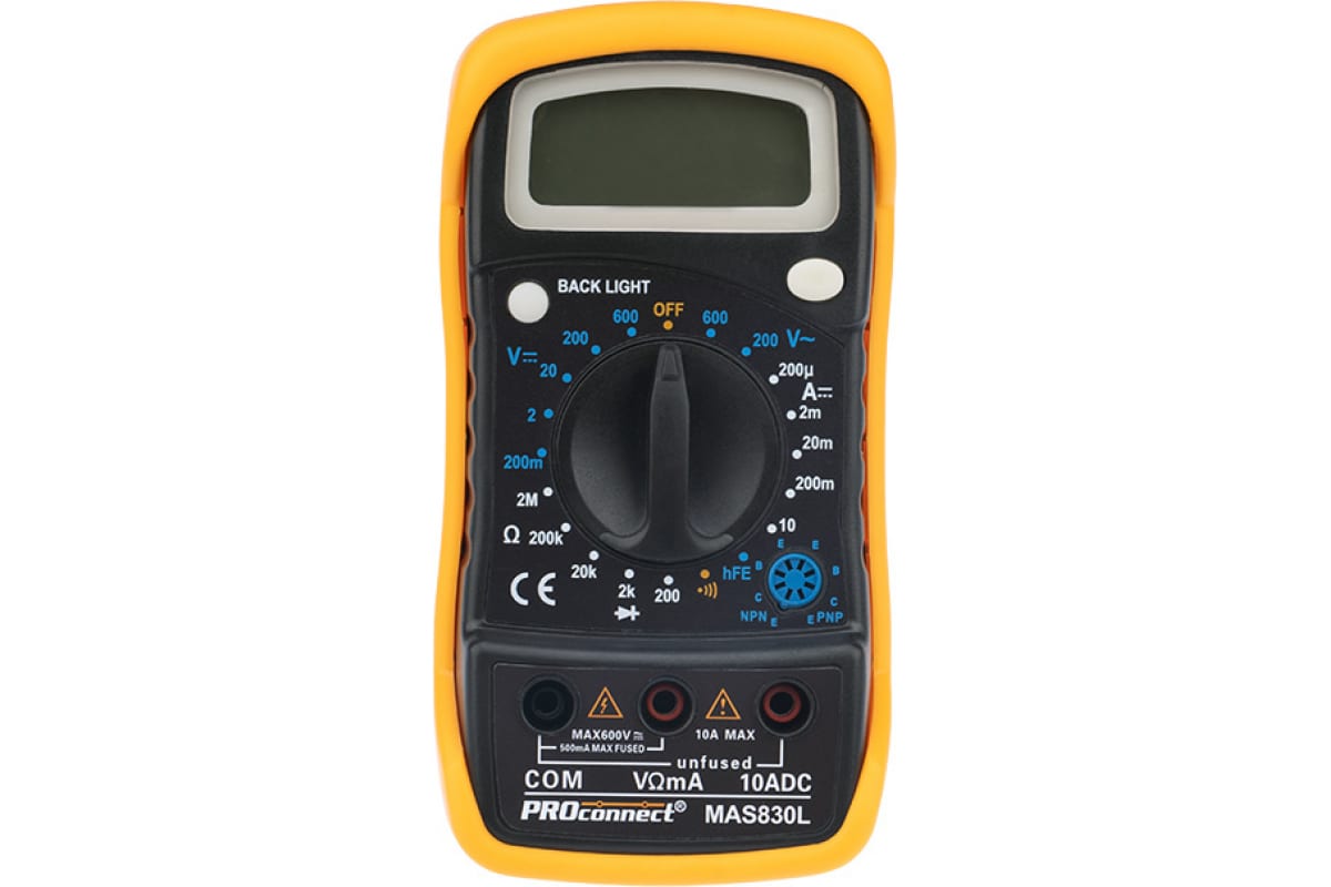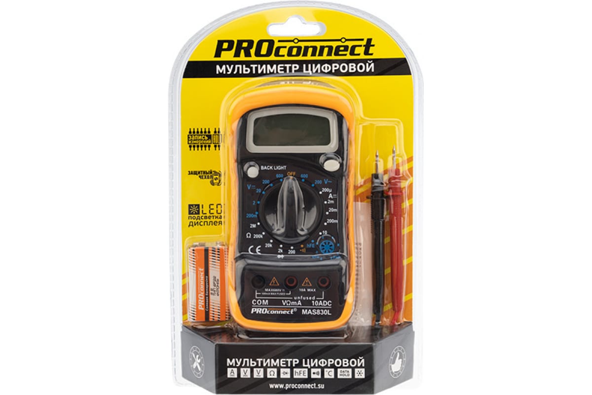Универсальный мультиметр PROconnect MAS830L 13-3021 измеряет постоянное и переменное напряжение, постоянный ток, сопротивление в цепи, а также проводят тест диодов и прозвонку цепи.