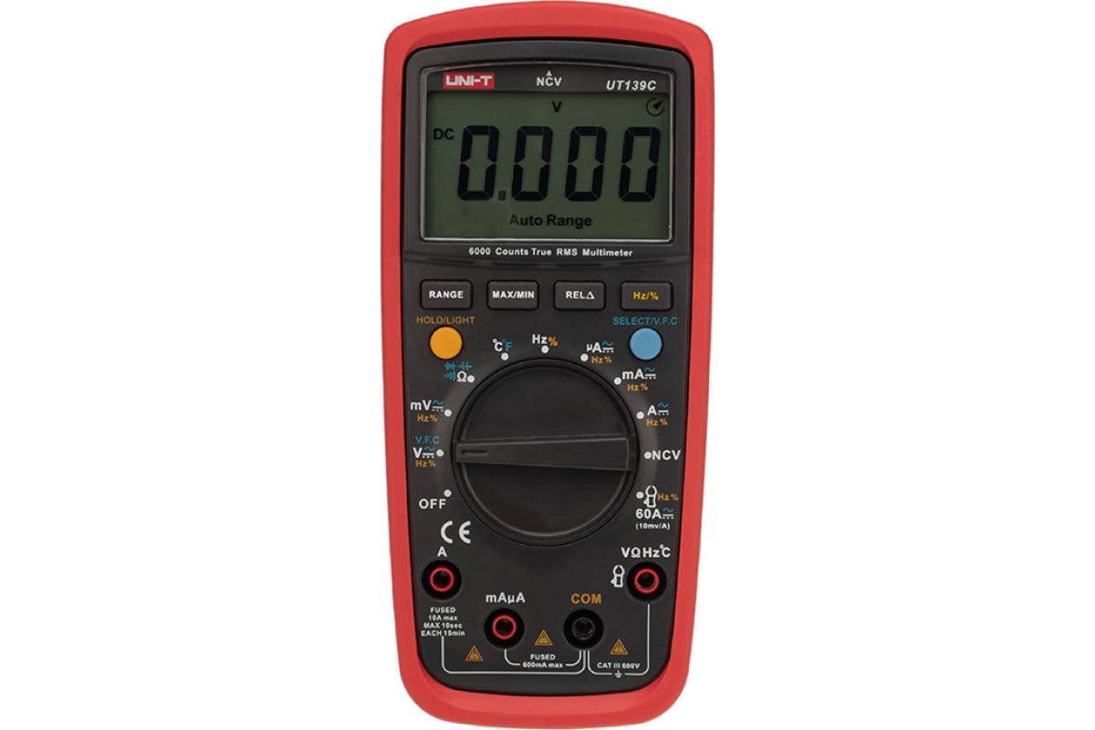 Универсальный мультиметр UNI-T UT139C с современным дизайном, большим дисплеем, подходит для измерения напряжения, силы тока, сопротивления, емкости, частоты и температуры. Обладает высоким классом точности. Имеет режим измерения среднеквадратичных значений TRUE RMS, бесконтактный детектер напряжения NCV.
