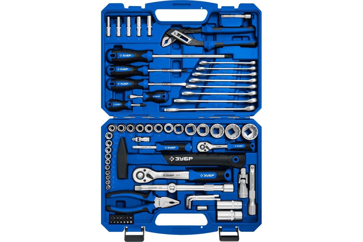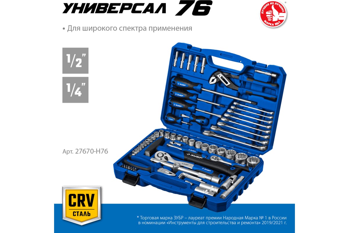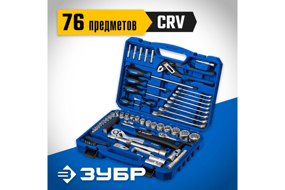 Универсальный набор инструмента ЗУБР Универсал-76 76 предметов 27670-H76 удовлетворяет требованиям ГОСТов и международных стандартов. Имеет большой ресурс и сохраняет свои высокие свойства на протяжении всего срока службы. Применяется для работ с крепежом. Предназначен для выполнения слесарных, монтажных и ремонтных работ.