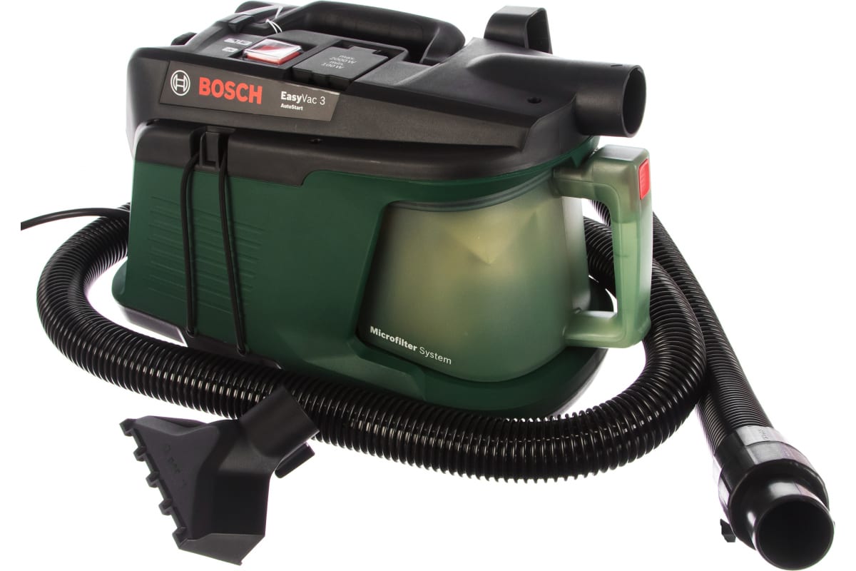 Универсальный пылесос Bosch EasyVac 3 0.603.3D1.000 подходит для уборки строительных площадок и частных мастерских. Он имеет прозрачные стенки, благодаря которым можно контролировать количество собранного мусора. Пылесос оборудован розеткой с автоматикой включения/выключения и универсальным адаптером, что позволяет подключать к нему практически все электроинструменты. Для удобной фиксации шланга на корпусе аппарата предусмотрены специальные крючки с резинками.