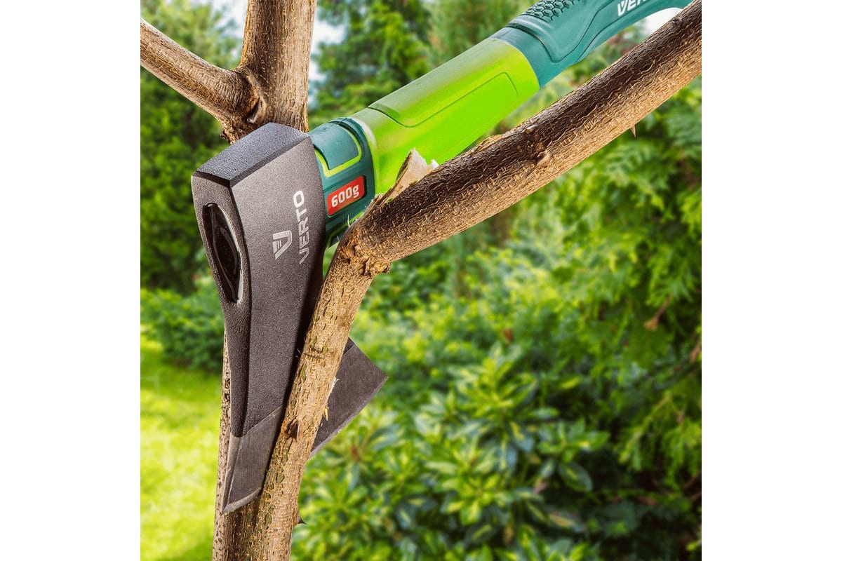 Универсальный топор с топорищем из стекловолокна, 860 г, вес обуха 600 г VERTO 05G201 используется преимущественно для работы с древесиной в бытовых и садовых работах.