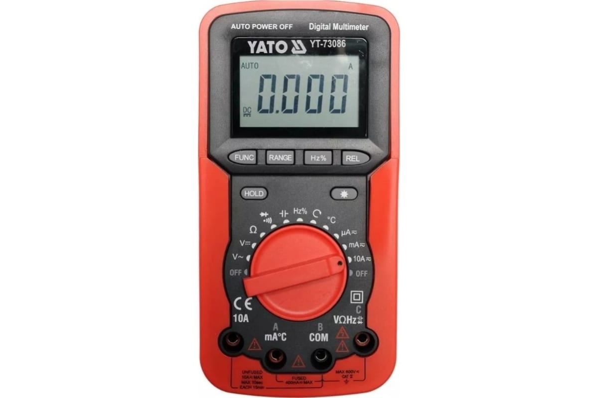 YT-73086 – это универсальный мультиметр от ТМ YATO. Прибор позволяет определить постоянное напряжение и переменный ток, сопротивление и емкость, температуру, частоту и коэффициент заполнения. Помимо этого, с помощью прибора можно обнаружить фазу.