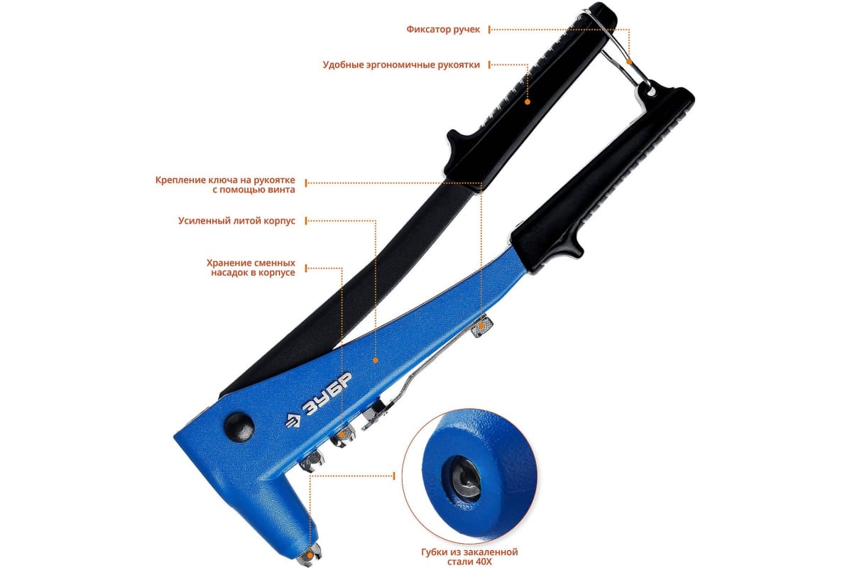Преимущества заклепочника ЗУБР 31192_z01- Губки из закаленной стали 40X обеспечивают высокий ресурс работы;