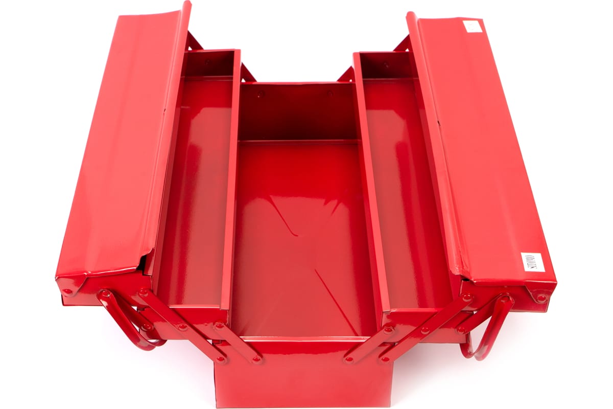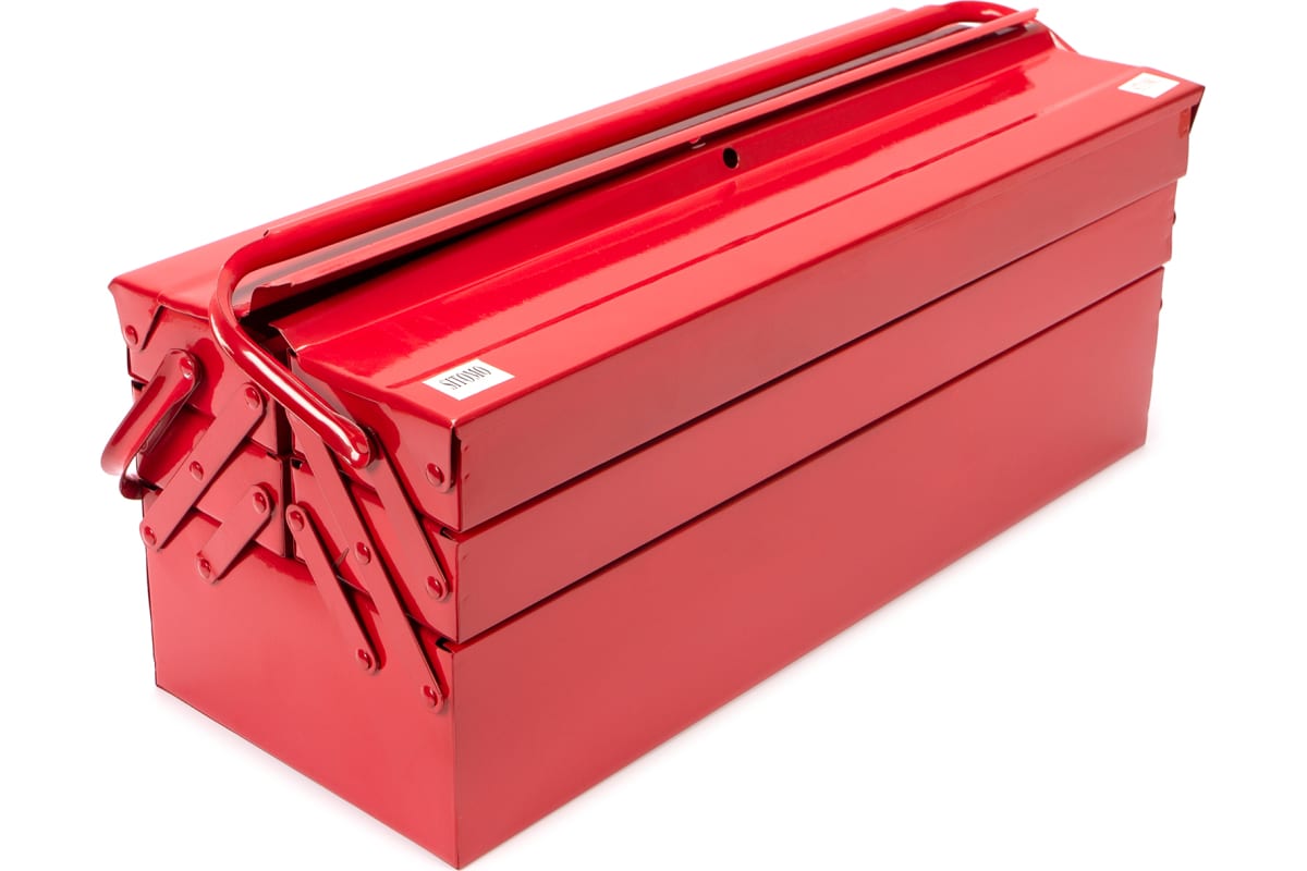 Металлический ящик для инструментов позволяет организовать хранение и транспортировку ручного инструмента. Наличие трех секций помогает хранить отдельно инструмент и расходные материалы. Ручка складывается для более компактного хранения.
