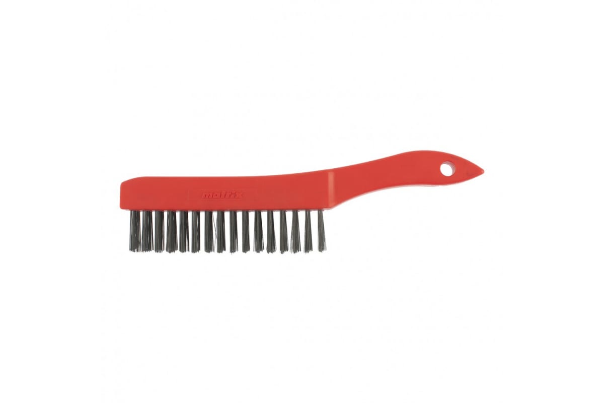 Зачистная 4-рядная щетка Matrix 74814 с пластиковой ручкой и щетиной из закаленной прямой проволоки используется для удаления загрязнений, ржавчины, остатков лакокрасочных покрытий с металлических, деревянных, бетонных поверхностей. Пучки расположены в 4 ряда, в каждом пучке 20 щетинок, поэтому щетка выдерживает повышенные нагрузки и обеспечивает качественную обработку. Рукоятка изогнута для повышения комфортности использования. Щетка пригодится во время строительных и ремонтных работ, а также будет полезна дома или в гараже.