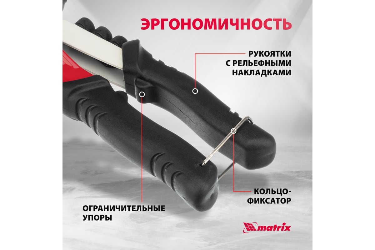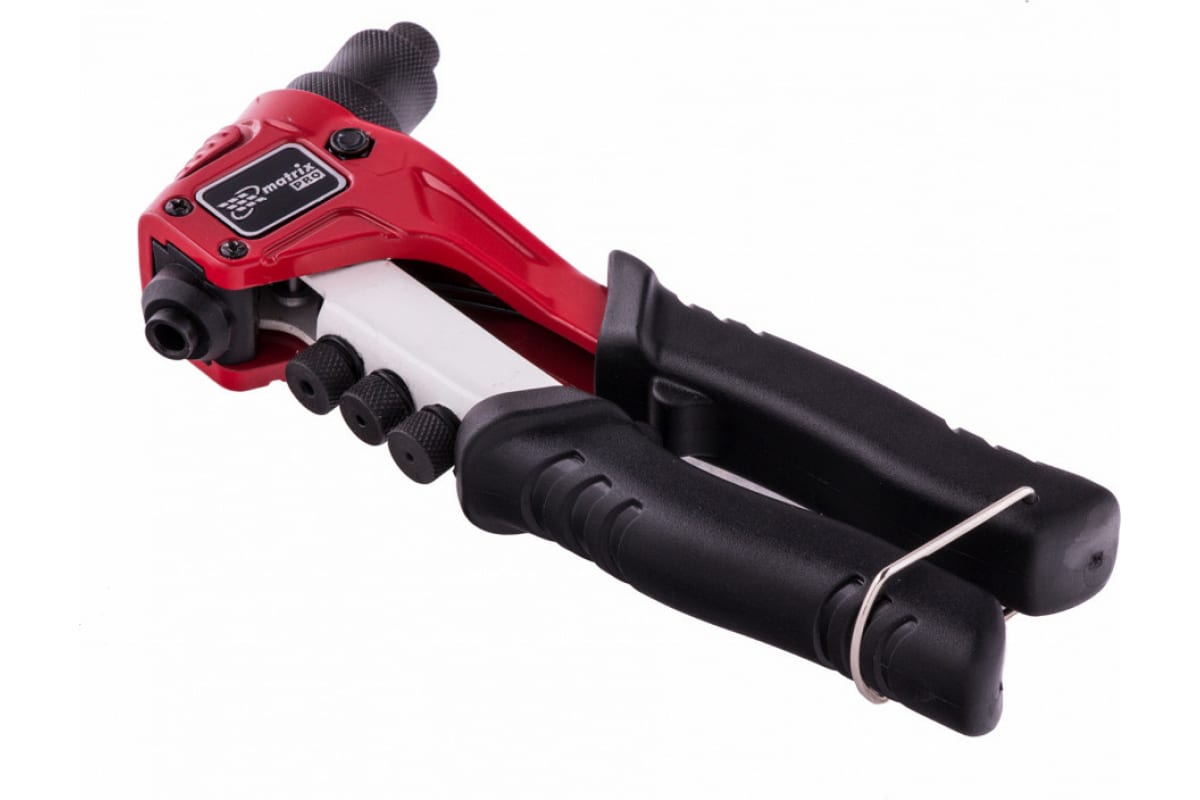 Преимущества заклепочника MATRIX 40546- Трехсегментный цанговый зажим из Cr-Mo обеспечивает надежную фиксацию вытяжной шпильки.