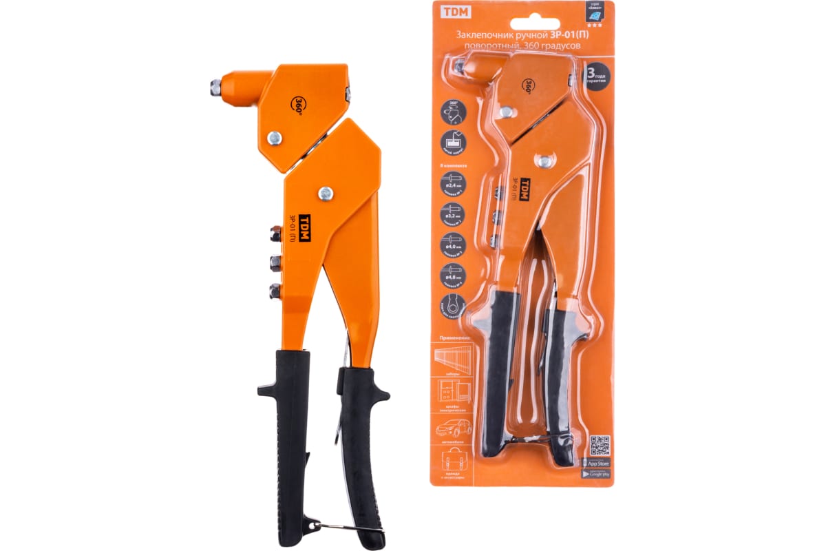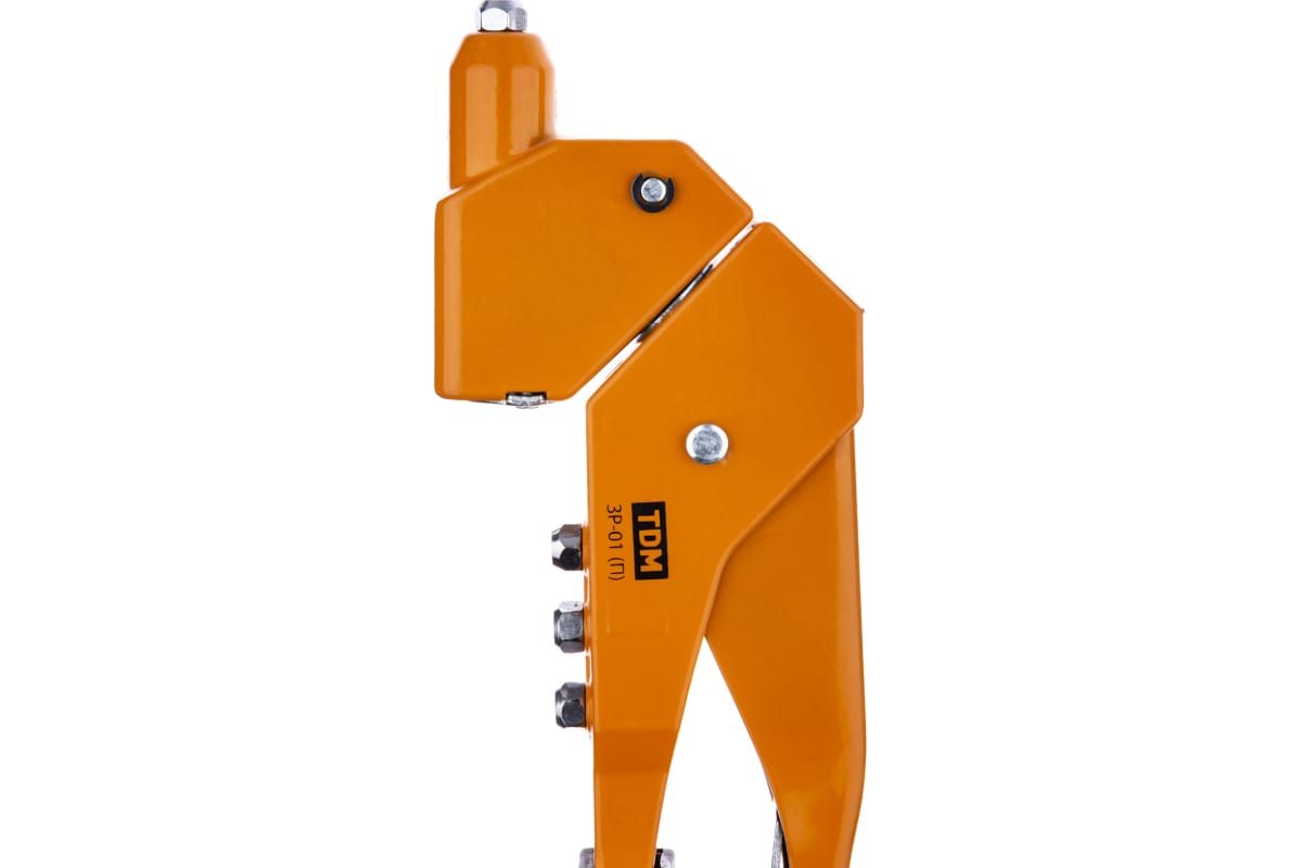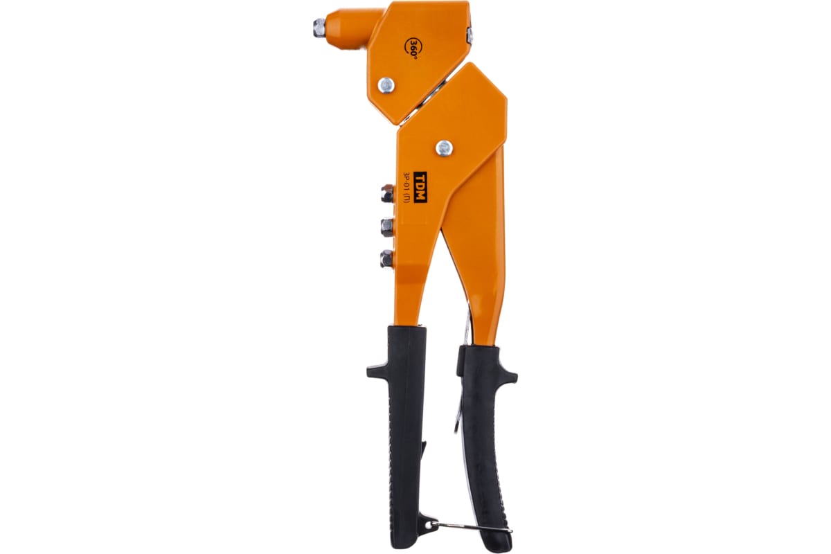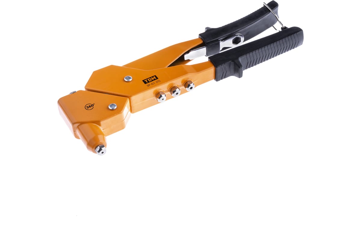 Заклепочник ручной TDM Алмаз ЗР-01П 2.4, 3.2, 4.0, 4.8 мм, поворотный, 360 градусов SQ1037-0101 предназначен для скрепления листовых материалов с помощью установки вытяжных заклепок разного диаметра. Литой стальной корпус изделия характеризуется особой прочностью и долговечностью. Поворотная головка пистолета облегчает установку заклепок в труднодоступных местах. Удобные рукоятки из ПВХ эргономичны и не скользят в руках.