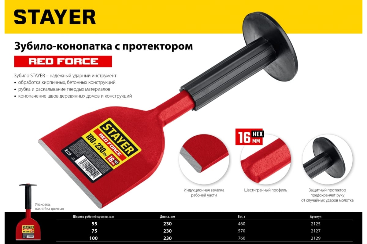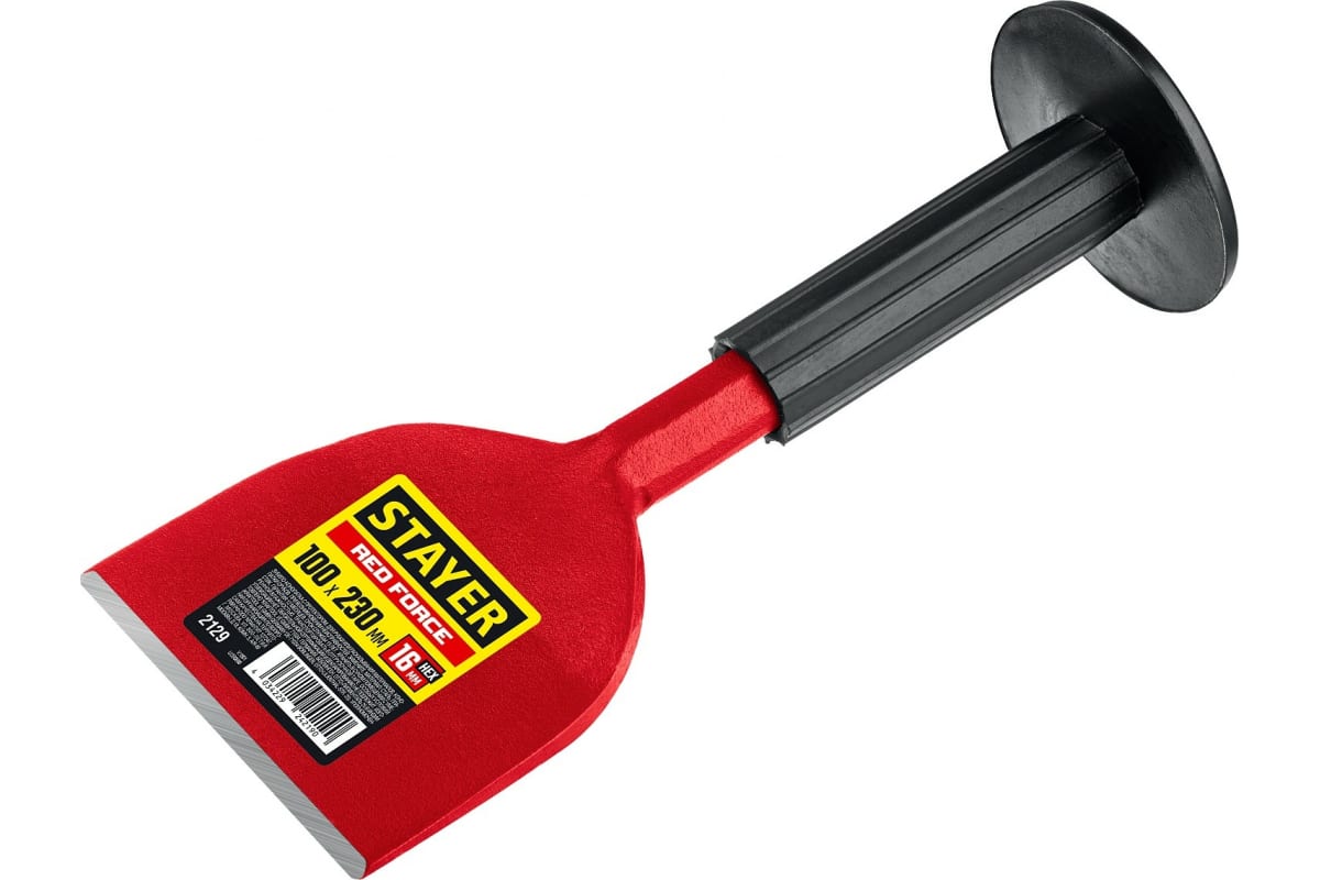Зубило-конопатка STAYER Red Force с протектором 100x230 мм 2129 - это надежный ударный инструмент для обработки каменных конструкций, для рубки или раскалывания различных материалов. Используется для демонтажа кирпичных и бетонных конструкций и сооружений, прорубания канавок и пазов. Защитный протектор защищает от случайных ударов молотка и других инструментов.