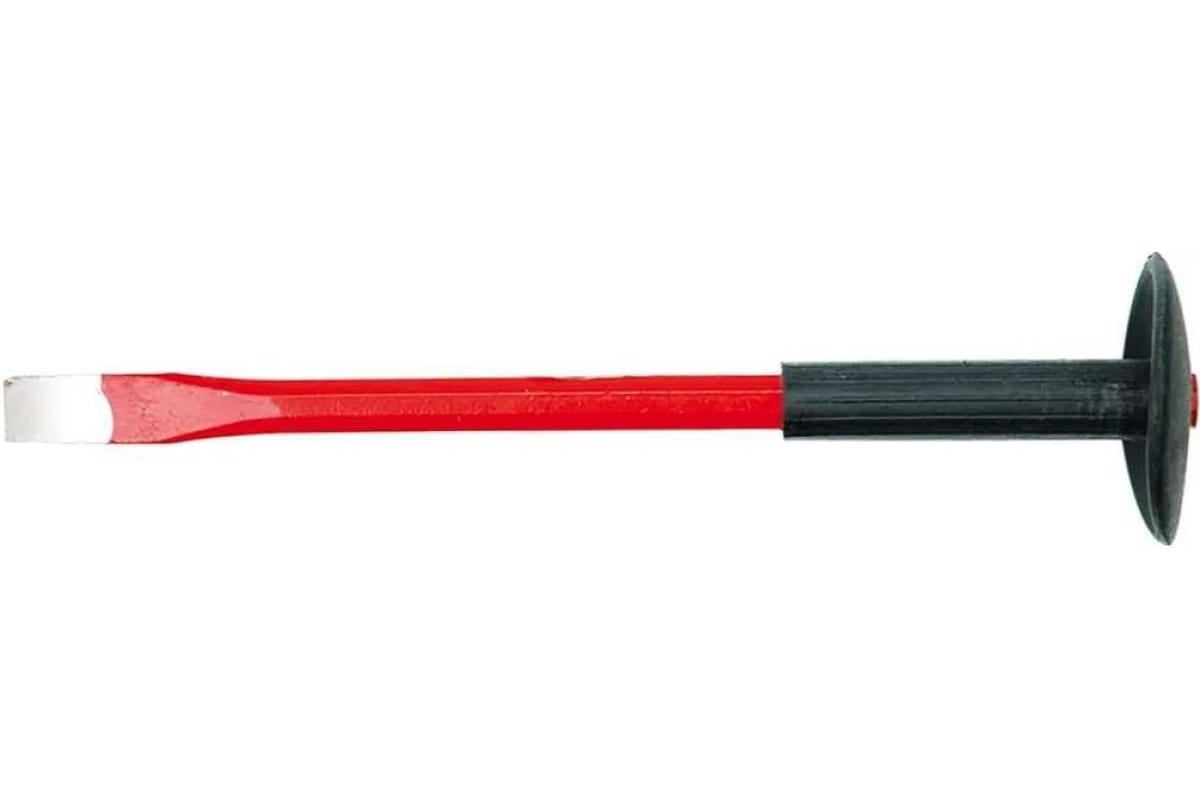 Зубило с протектором позволяет разрубать камни и цемент при демонтажных работах. Изготовлено из восьмиугольного стального стержня, поверхность красного цвета лакирована. Инструмент оснащен пластиковым протектором, который защищает от случайного попадания молотком по руке.