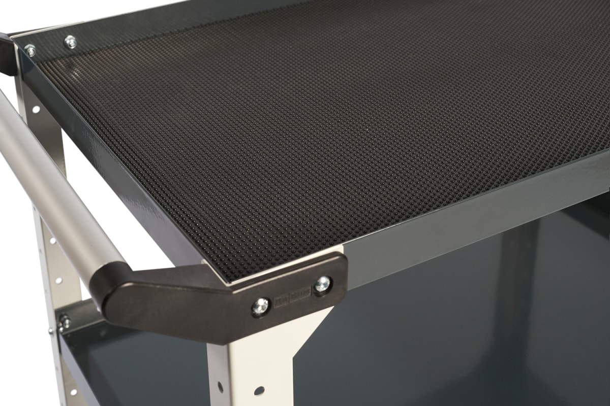 Тележка с алюминиевой ручкой. Верхняя полка укомплектована ковриком из противоскользящей резины.