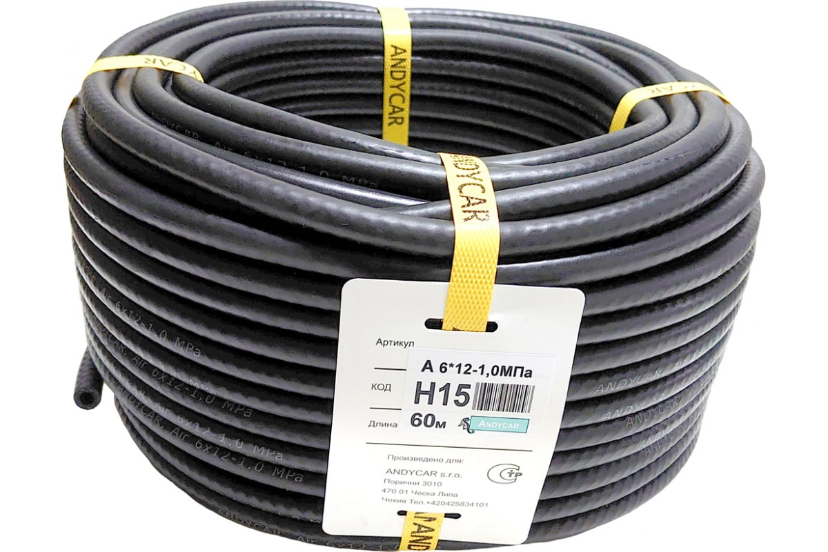 Шланг резиновый 3-х слойный пневматический для подачи воздуха (6х12 мм; 10 атм.; бухта 60 м) Andycar H15 используется для перекачки под давлением неагрессивных жидкостей и газов, углекислого газа, сжатого воздуха, горячей и холодной воды. Данный шланг также может быть применен для транспортировки технической воды, мытья автомобилей, ухода за городскими газонами и насаждениями и т.д.